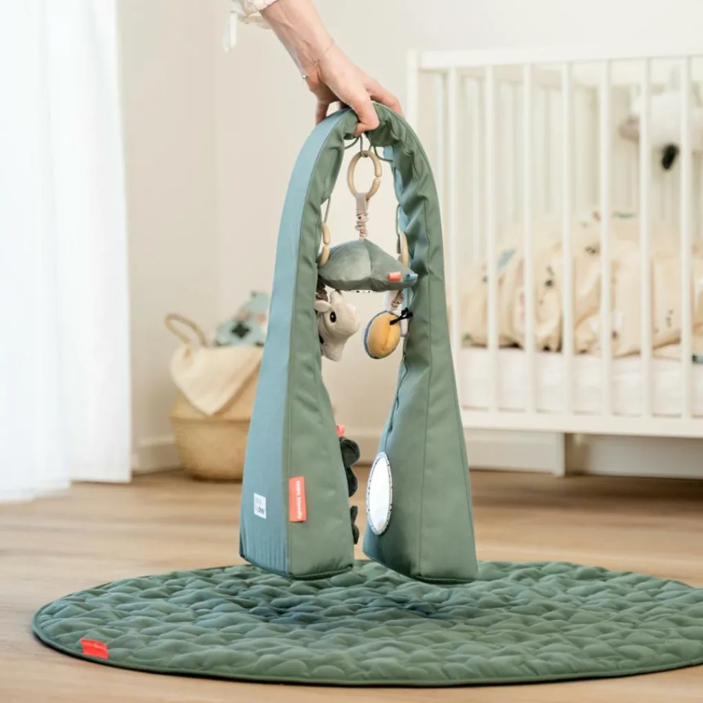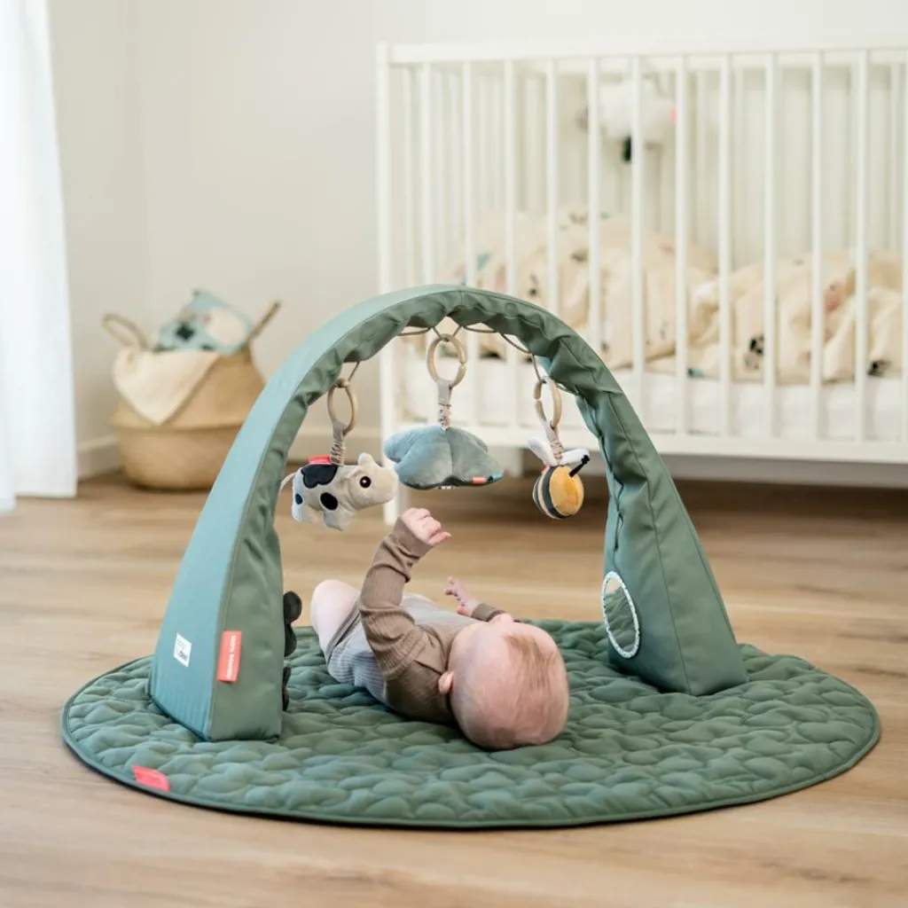 Éveillez la curiosité et la motricité de votre bébé avec l’arche d’activités Tiny Farm vert, un espace de jeu sensoriel complet et élégant !