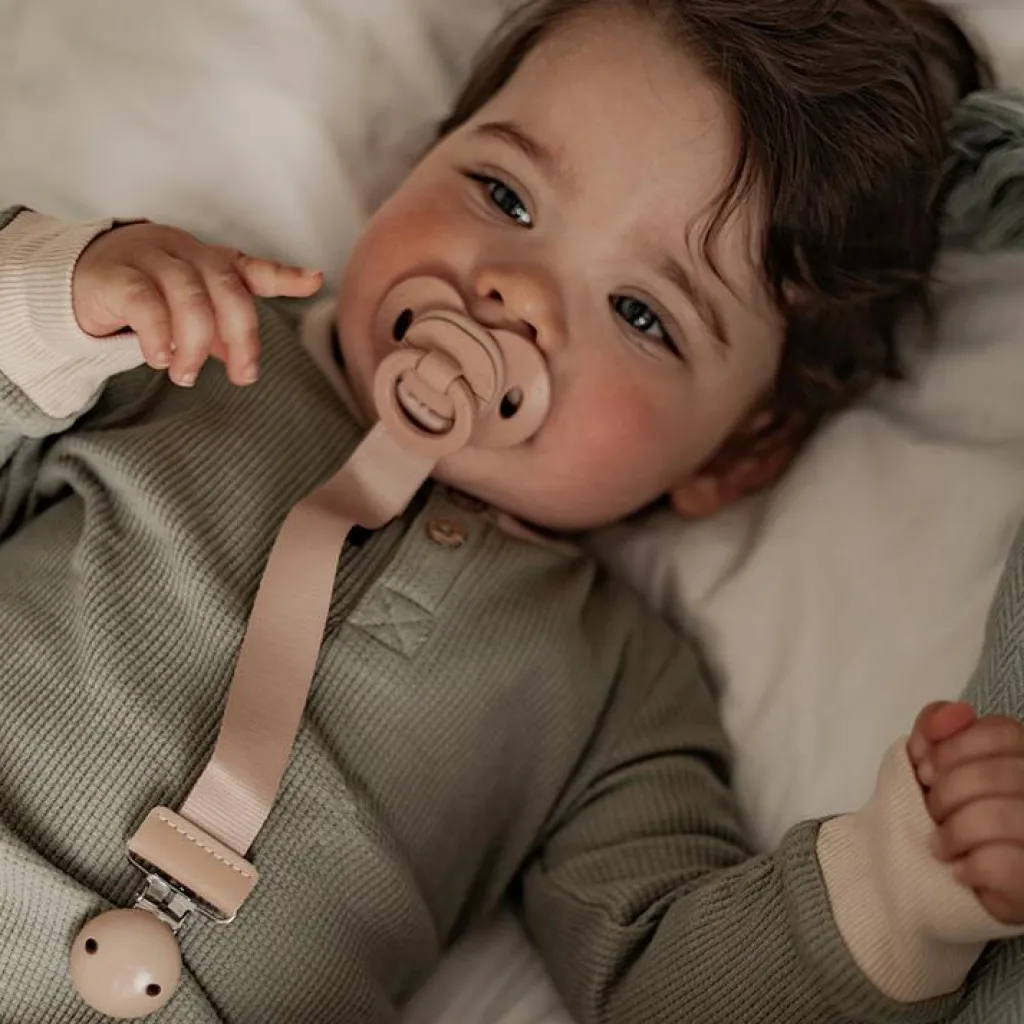 – Anneau en silicone souple qui peut s’attacher à presque tout type de sucettes.
