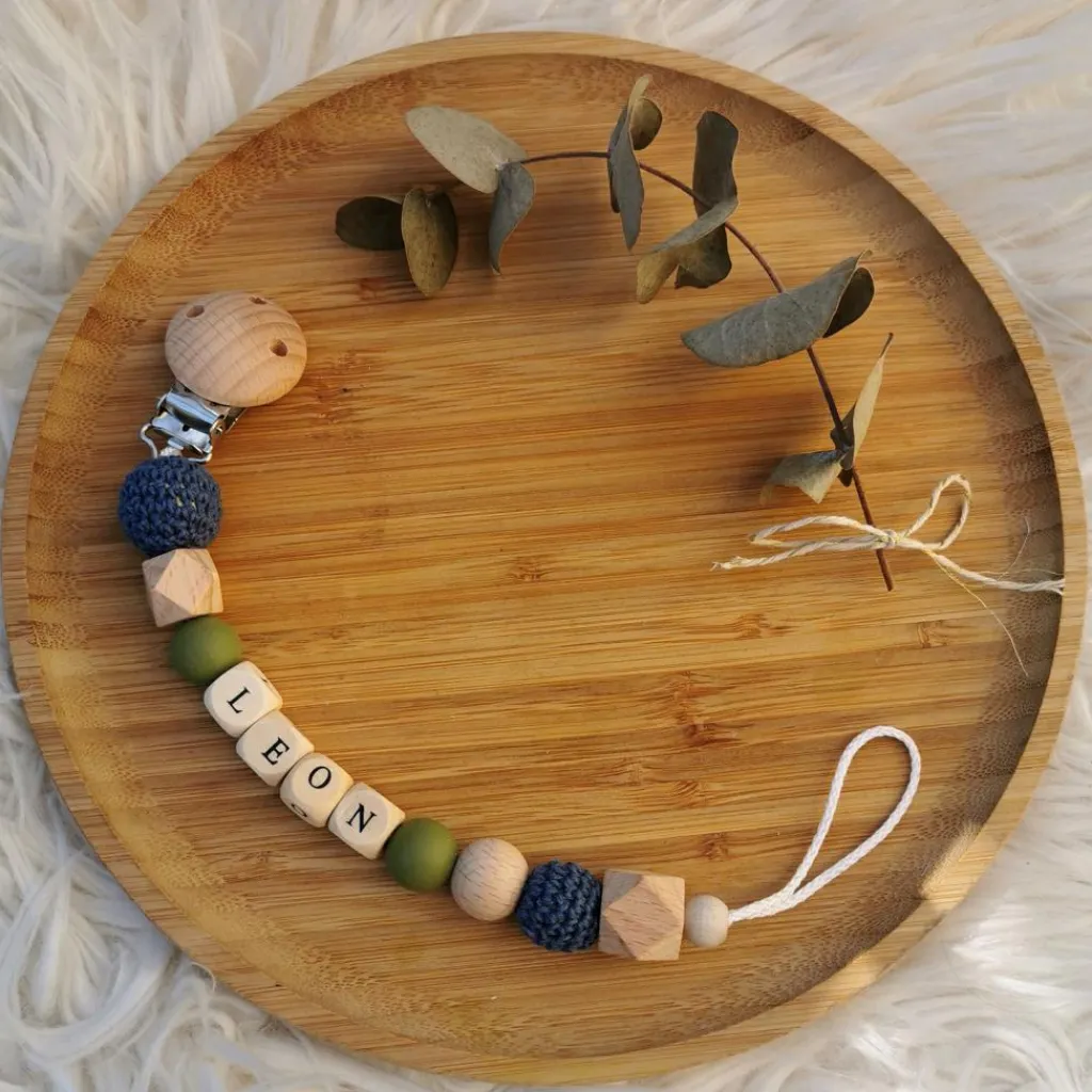 L’attache sucette en bois kaki et bleu nuit de la marque Tata Lucette évitera à bébé de perdre sa sucette, pour qu’elle soit toujours là pour lui apporter du réconfort. Réalisée avec des matériaux naturels sains pour l’enfant, elle stimulera aussi son toucher grâce aux différentes matières. En plus d’être pratique, cet accessoire peut être personnalisé pour le rendre unique.