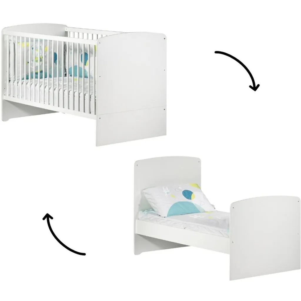 – Lit bébé à barreaux 70 x 140 cm, évolutif en lit junior sans barreaux 70 x 140 cm (pour les 3-7 ans).