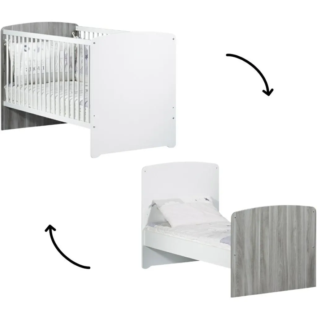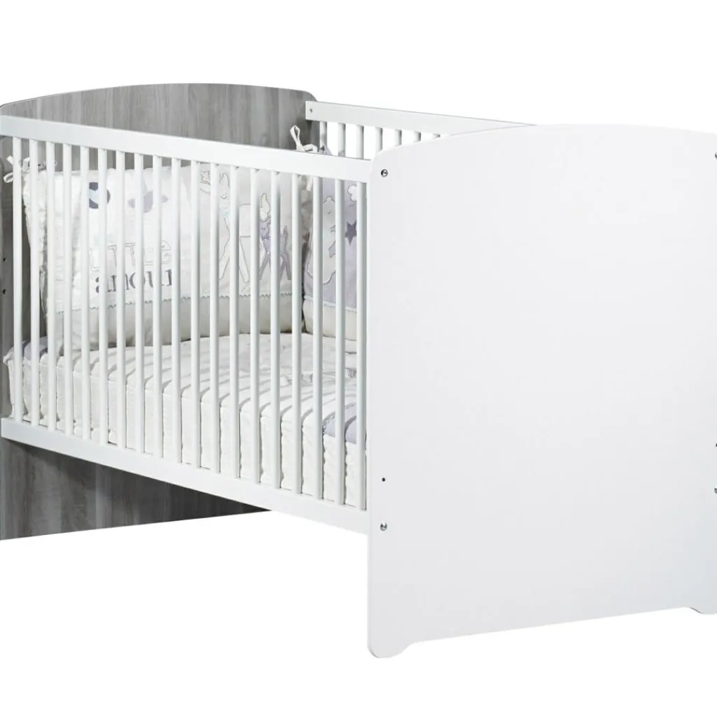 – Lit bébé à barreaux 70 x 140 cm, évolutif en lit junior sans barreaux 70 x 140 cm (pour les 3-7 ans).
