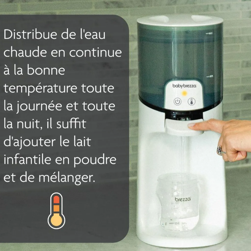 – Ajoutez le lait en poudre, mélangez et le biberon est prêt ! Laisser brancher et allumer la machine pour qu’elle chauffe en continue l’eau.