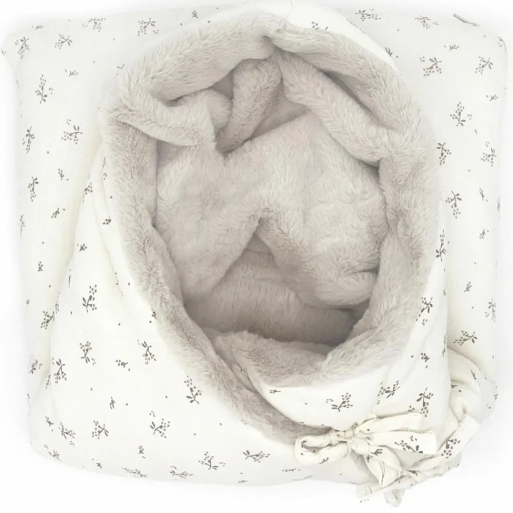 Une matière douce et respectueuse : L’extérieur est confectionné en gaze de coton organique imprimée, une matière respirante et respectueuse des peaux sensibles. L’intérieur, en polaire beige moelleuse, enveloppe bébé dans une bulle de chaleur et de douceur.