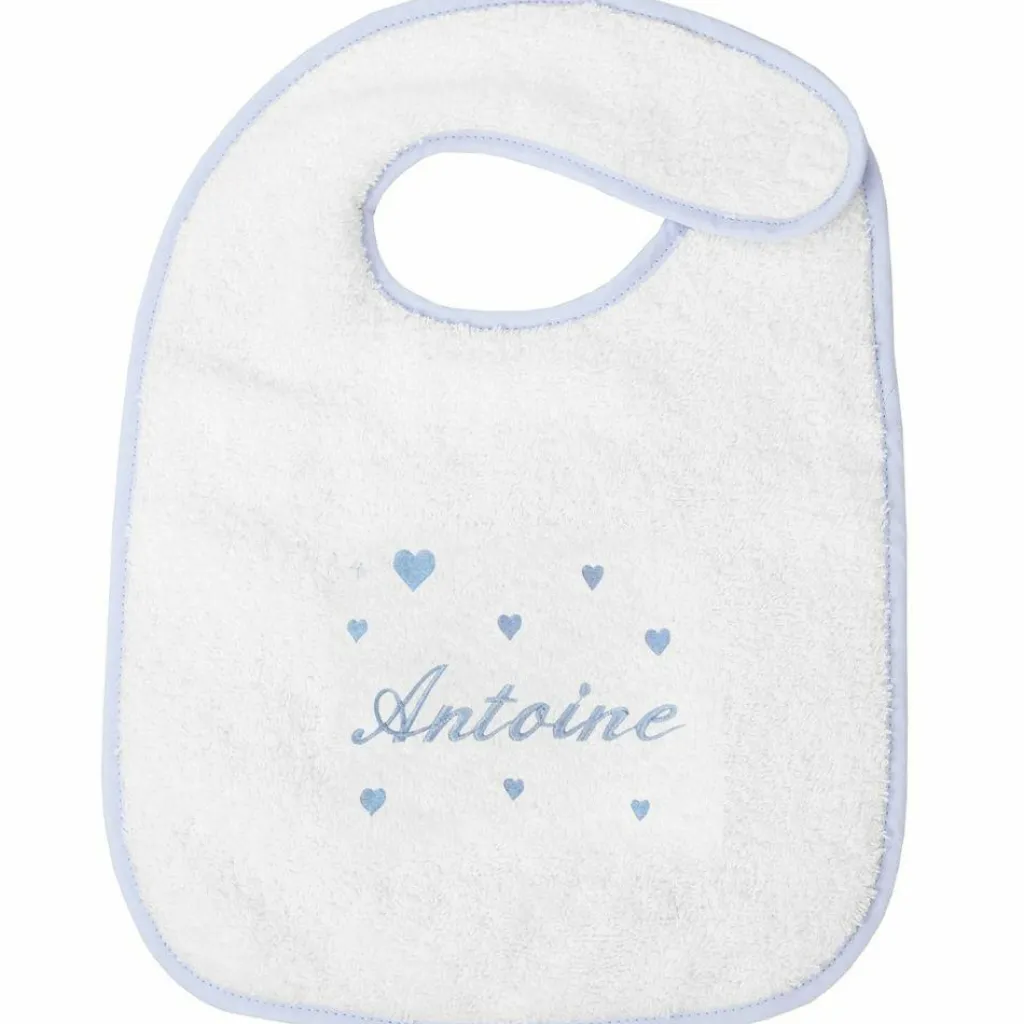 – Le prénom est brodé en bleu assorti au biais avec des coeurs.