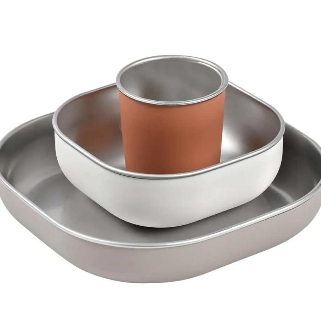 Complet, il comprend une assiette, un bol et un petit verre ergonomiques. Fabriqué en Inox, une matière inerte, il possède une surface lisse et non poreuse, ce qui empêche les aliments de s’incruster ou de pénétrer dans le matériau : il ne retient ni goûts ni odeurs. Adapté aux tout-petits, ce coffret est léger et incassable, garantissant une sécurité optimale lors des repas. Innovant il passe au micro-ondes, au réfrigérateur et au lave-vaisselle rendant son utilisation ultra pratique. Durable, il est conçu pour une longue utilisation grâce à sa solidité. La housse en silicone offre une protection anti-dérapante et anti-bruit (le silicone ne protège pas de la chaleur). Les formes ergonomiques, avec des bords hauts et des angles arrondis, ainsi que le petit verre, sont idéales pour apprendre à manger et boire comme un grand.