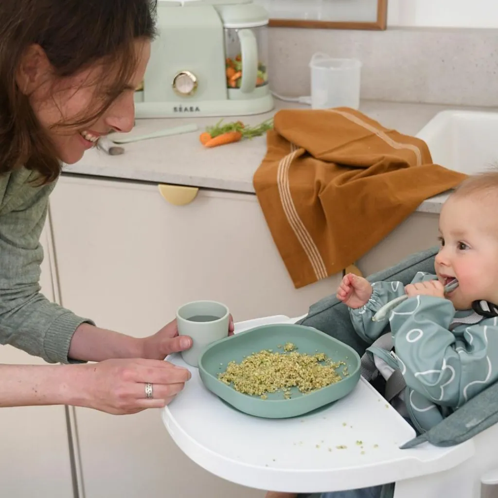 – Complet : il contient une assiette, un bol avec ventouse, un petit verre et une cuillère 2ème âge en silicone.