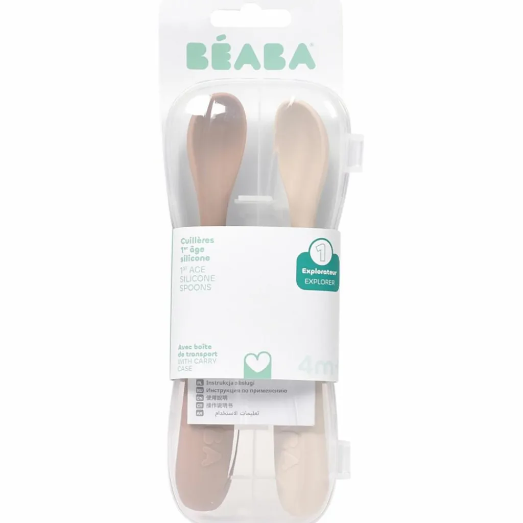Lot de 2 cuillères silicone 1er âge avec boîte de transport Béaba – l’allié douceur pour les premiers repas de bébé.
