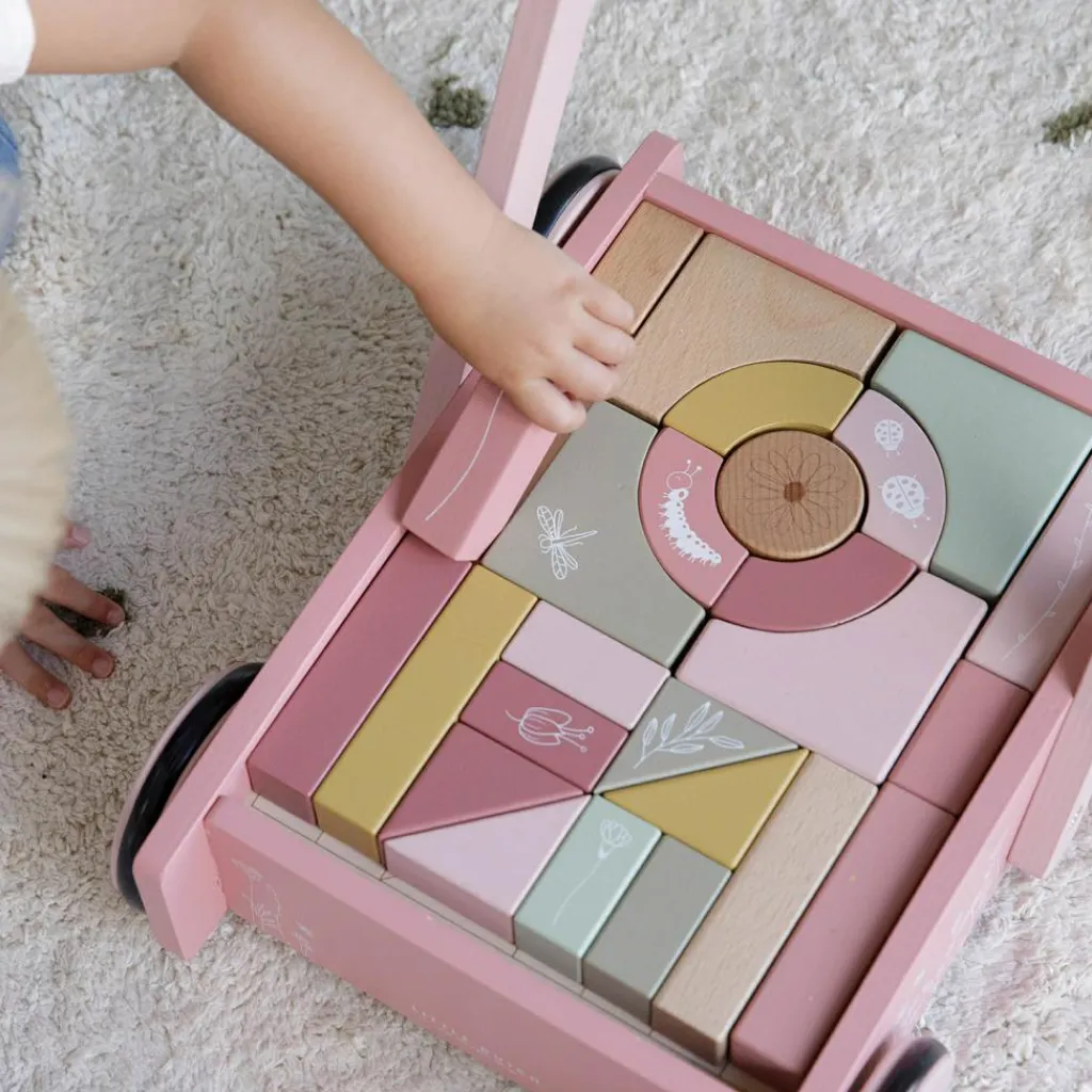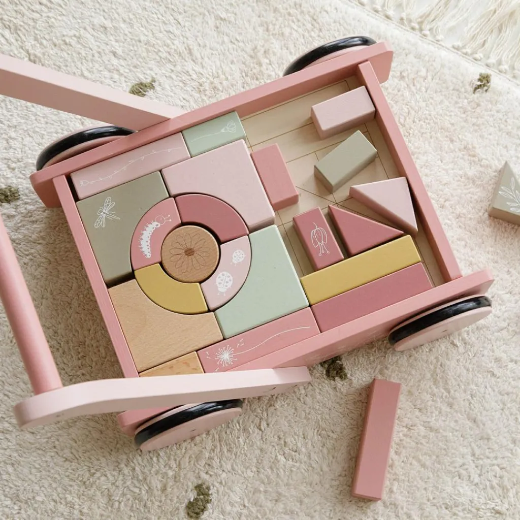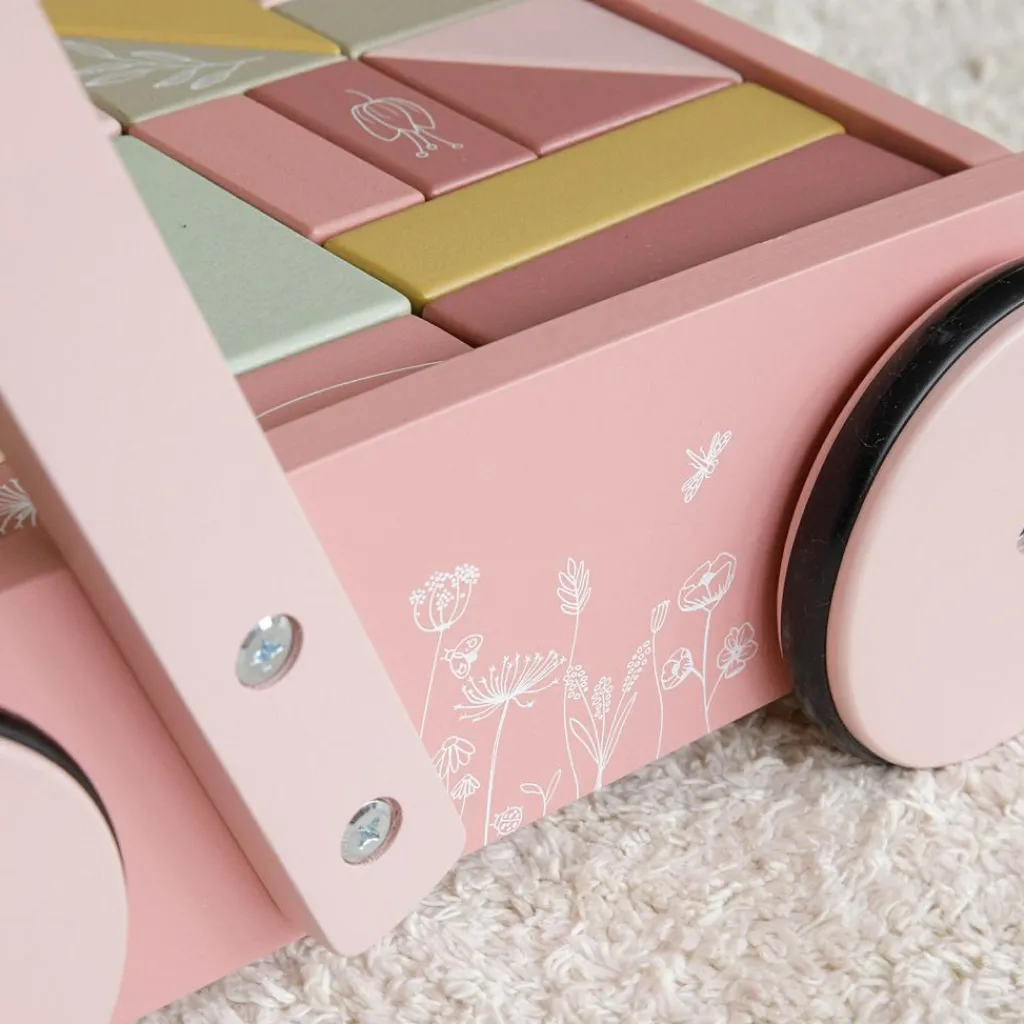 Le chariot avec blocs de construction Wild Flowers de la marque Little Dutch laisse place à la créativité de votre enfant qui construit ce dont il a envie ! Lorsqu’il veut changer de jeu, il peut s’amuser à encastrer les blocs pour pouvoir les transporter en poussant le chariot de transport.