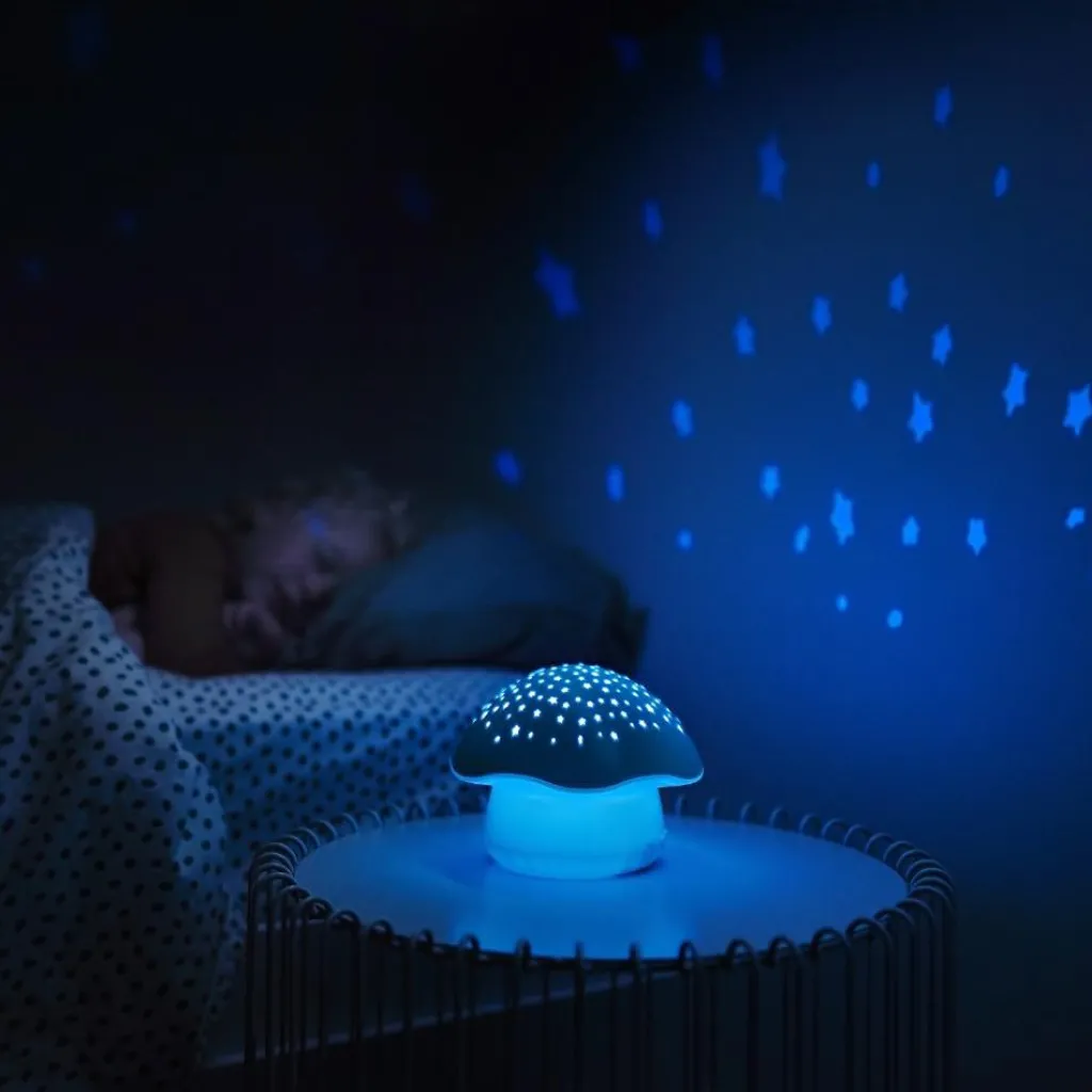Le projecteur d’étoiles champignon de la marque Pabobo aide bébé à s’endormir paisiblement en projetant au plafond un joli ciel étoilé, accompagné ou non de musique.