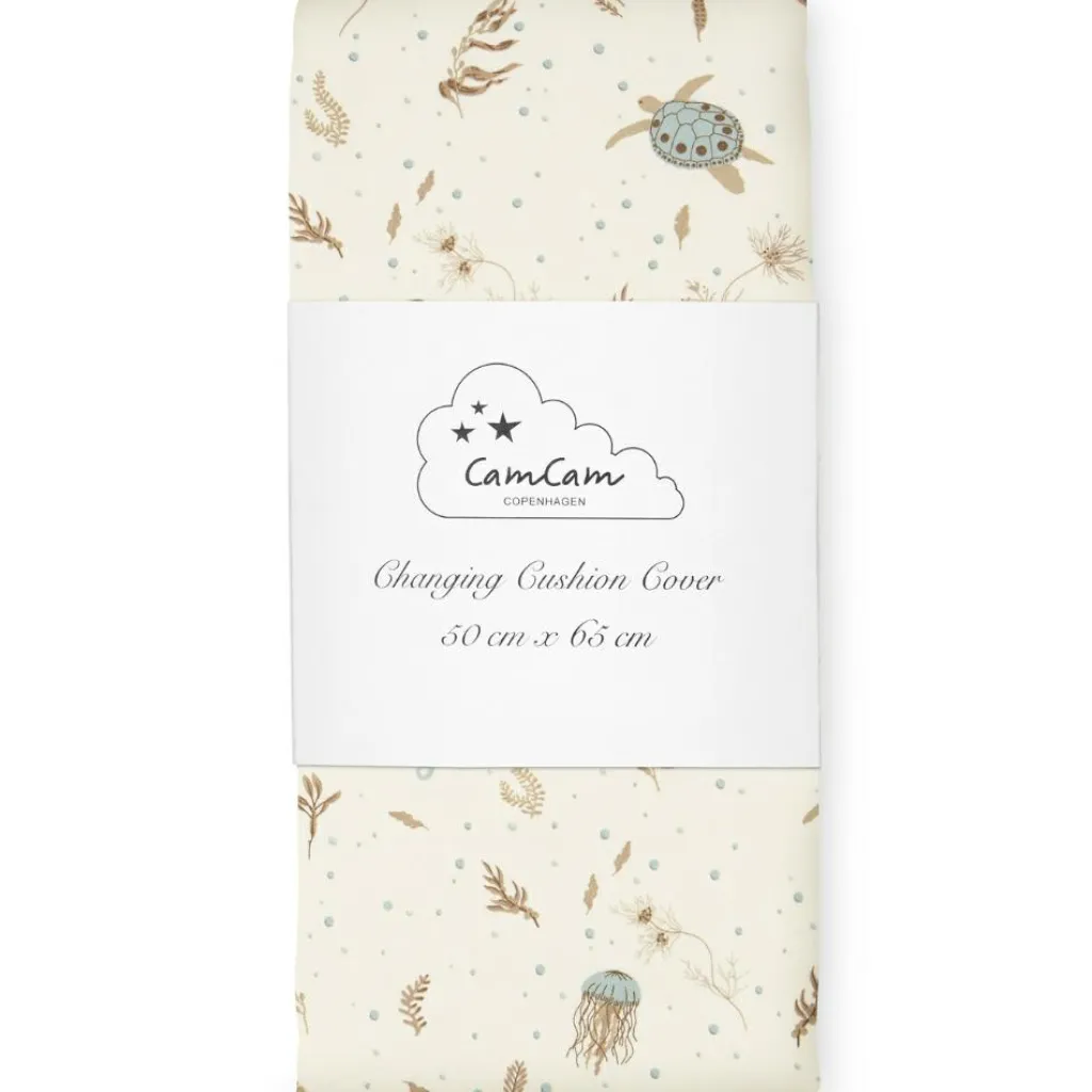 – Housse de matelas à langer dans les tons vert, marron et bleu sur fond blanc crème.