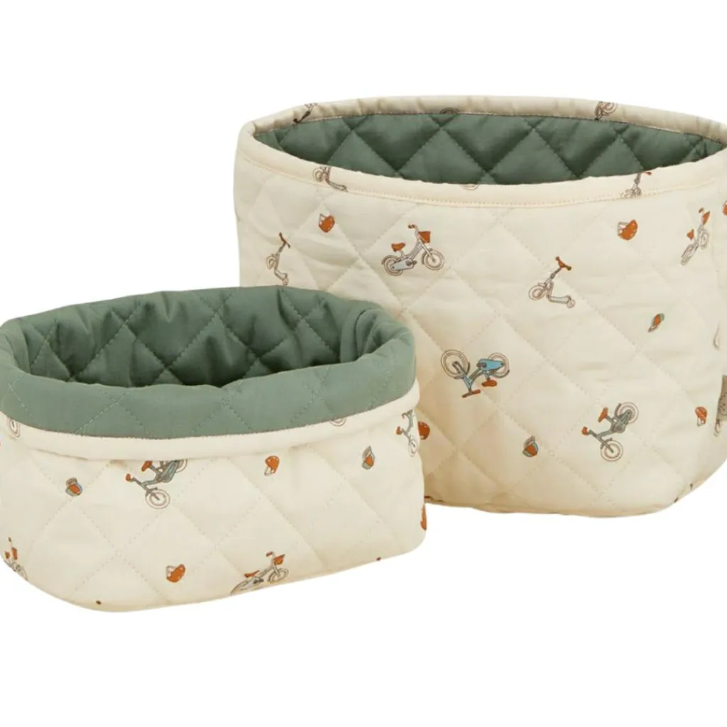 – Paniers de rangement matelassés – Set de deux dans les tons vert, marron et bleu sur fond blanc crème.