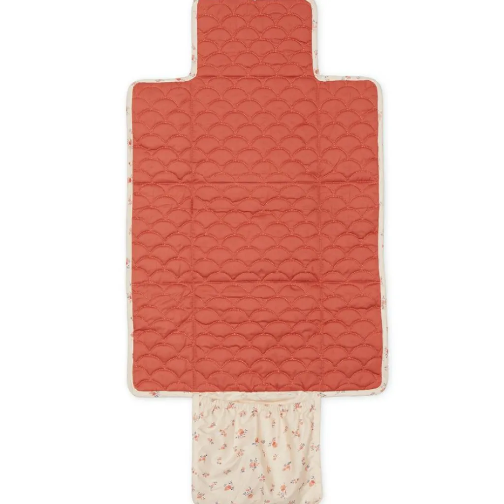 – Matelas à langer de voyage, matelassé dans les tons rose, rouge et bleu sur fond blanc crème.