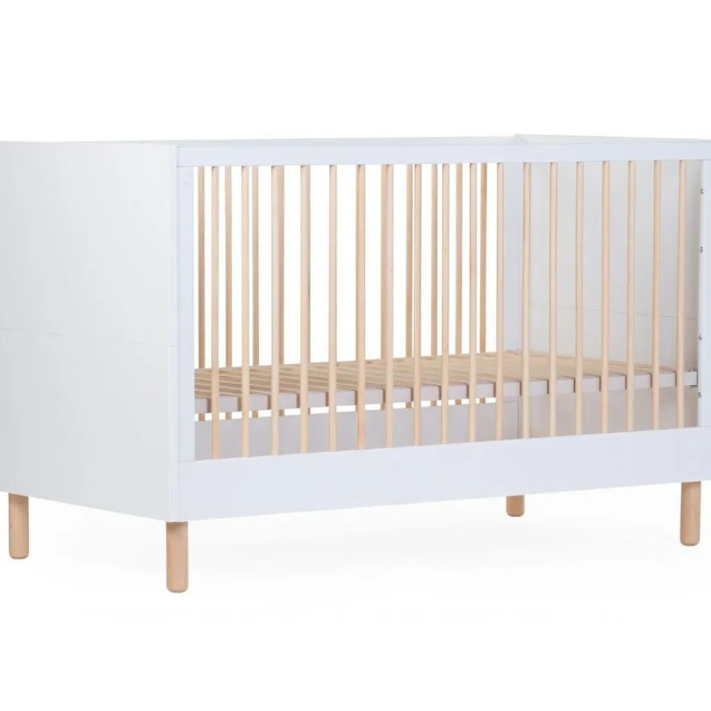 – Joli lit bébé blanc avec des éléments en bois massif.