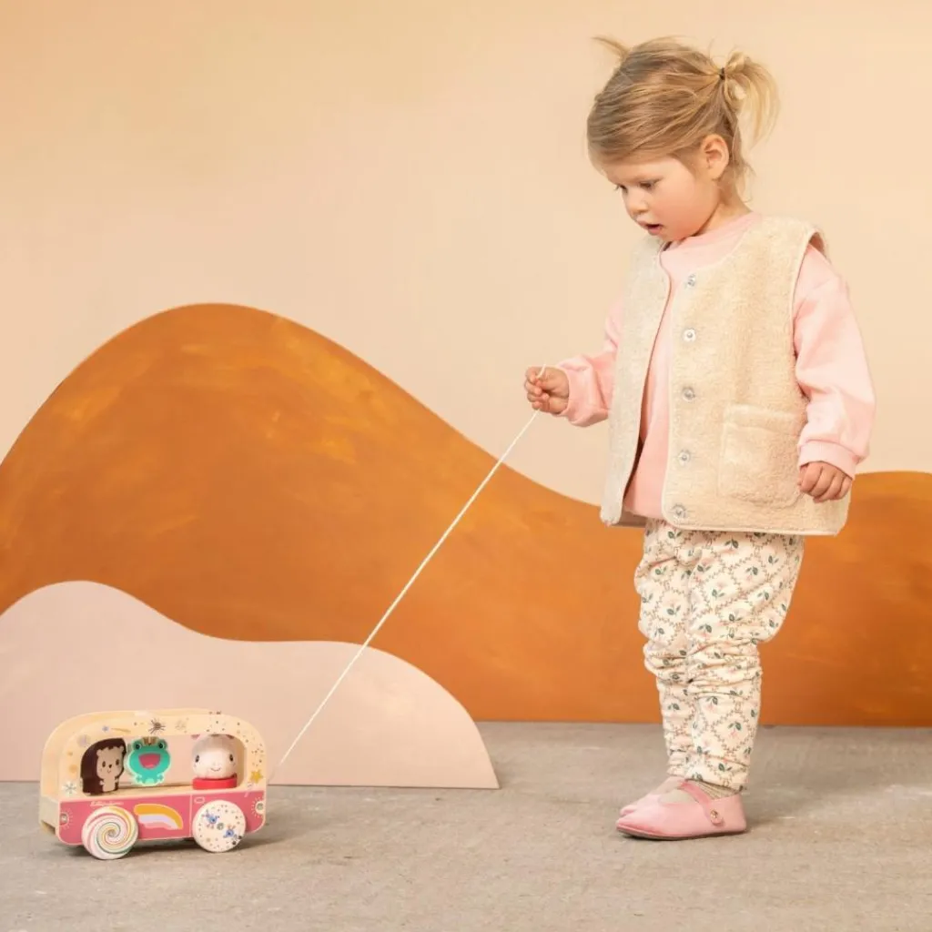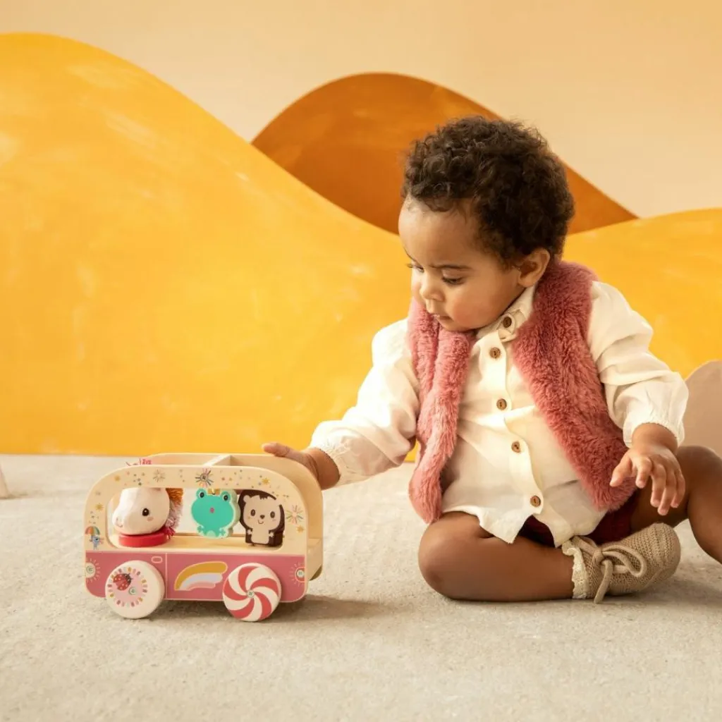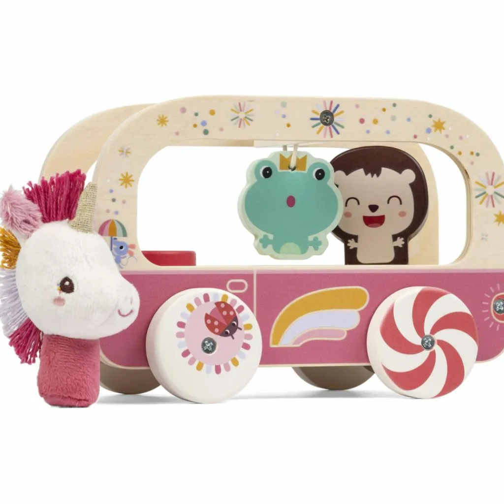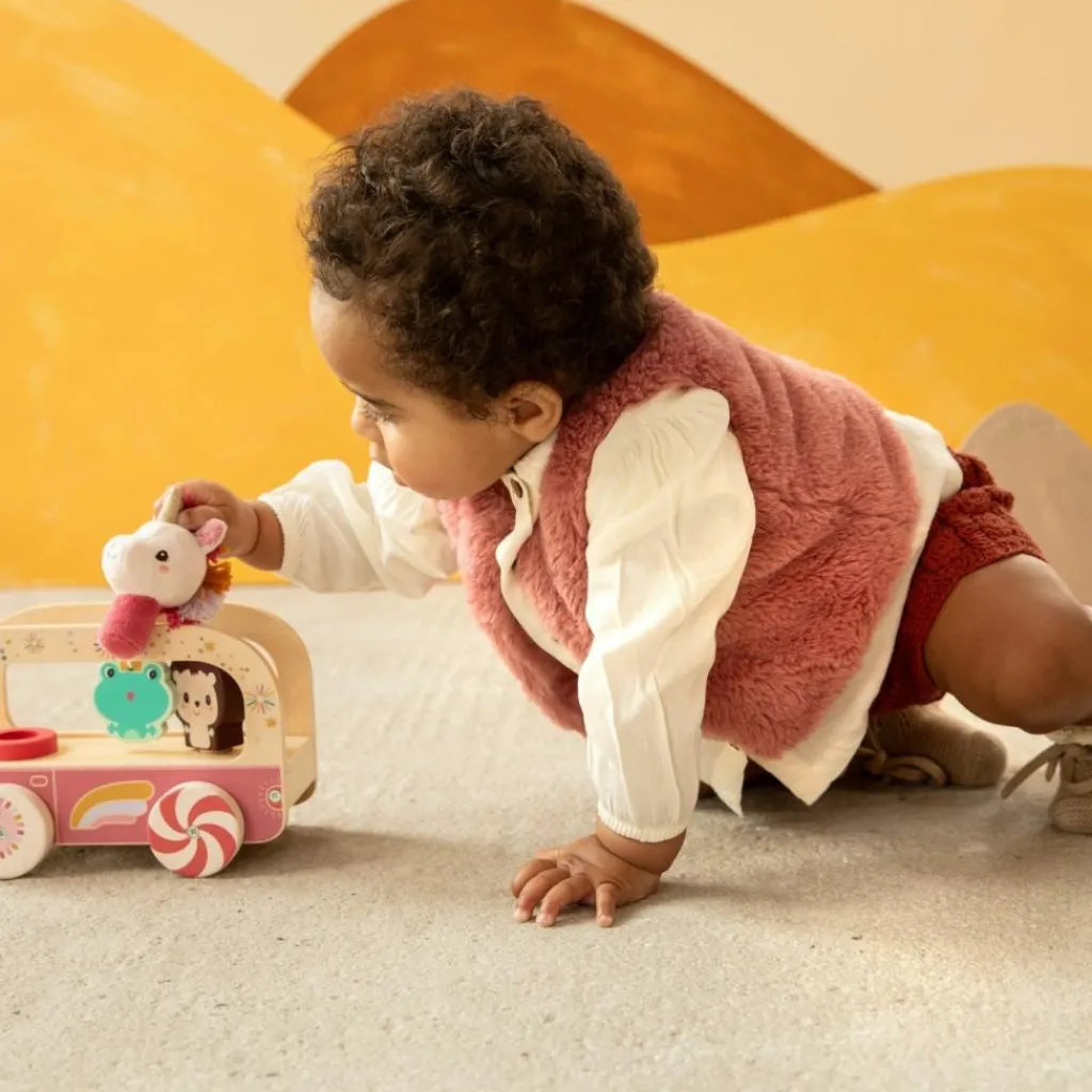 Un, deux, trois… et c’est parti ! Bébé pousse le bus et la magie opère : les roues colorées tournent et créent de drôles d’effets visuels. À l’intérieur, Léon le hérisson s’anime, la grenouille se balance et Léna la licorne peut même descendre pour explorer le monde qui l’entoure. Quand l’enfant commence à marcher, il pourra utiliser la corde pour promener tout ce joyeux petit monde. Ce jouet en bois et tissu est une belle invitation à l’exploration, à la motricité et au jeu d’imitation.