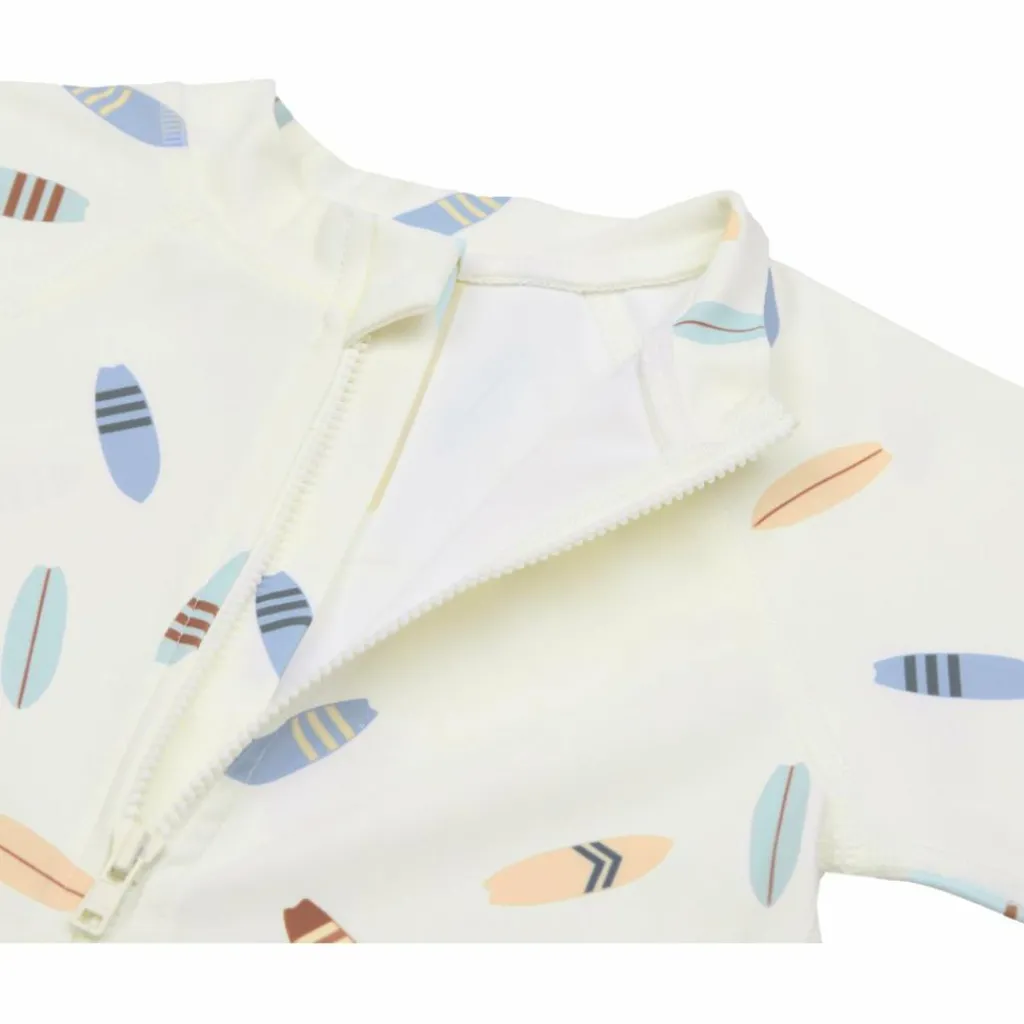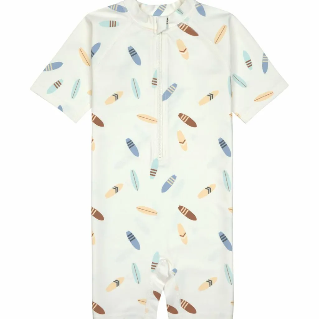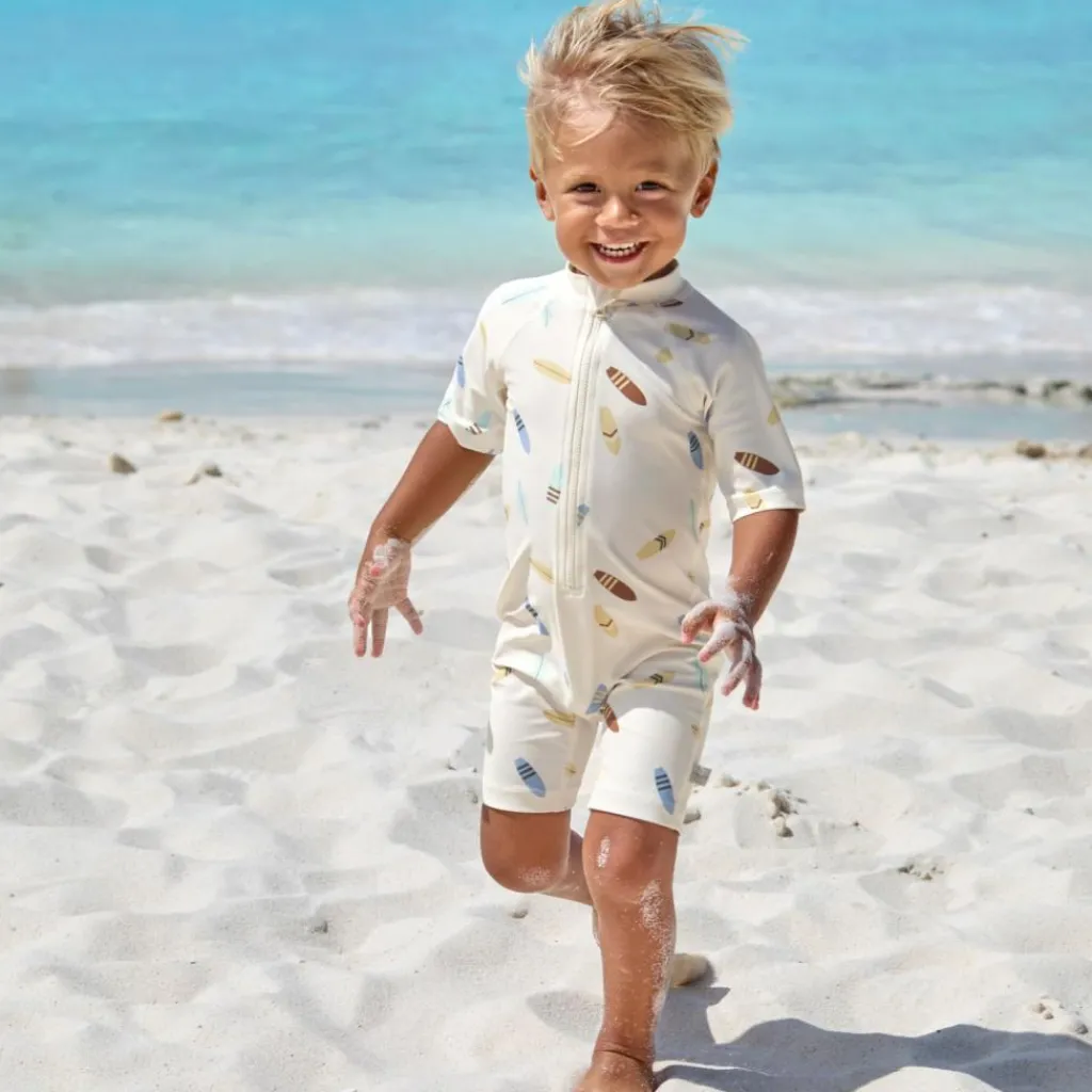 – Avis aux petits surfeurs ! En combinaison à manches courtes avec un indice de protection UV 60, plus rien n’empêche la prochaine baignade.
