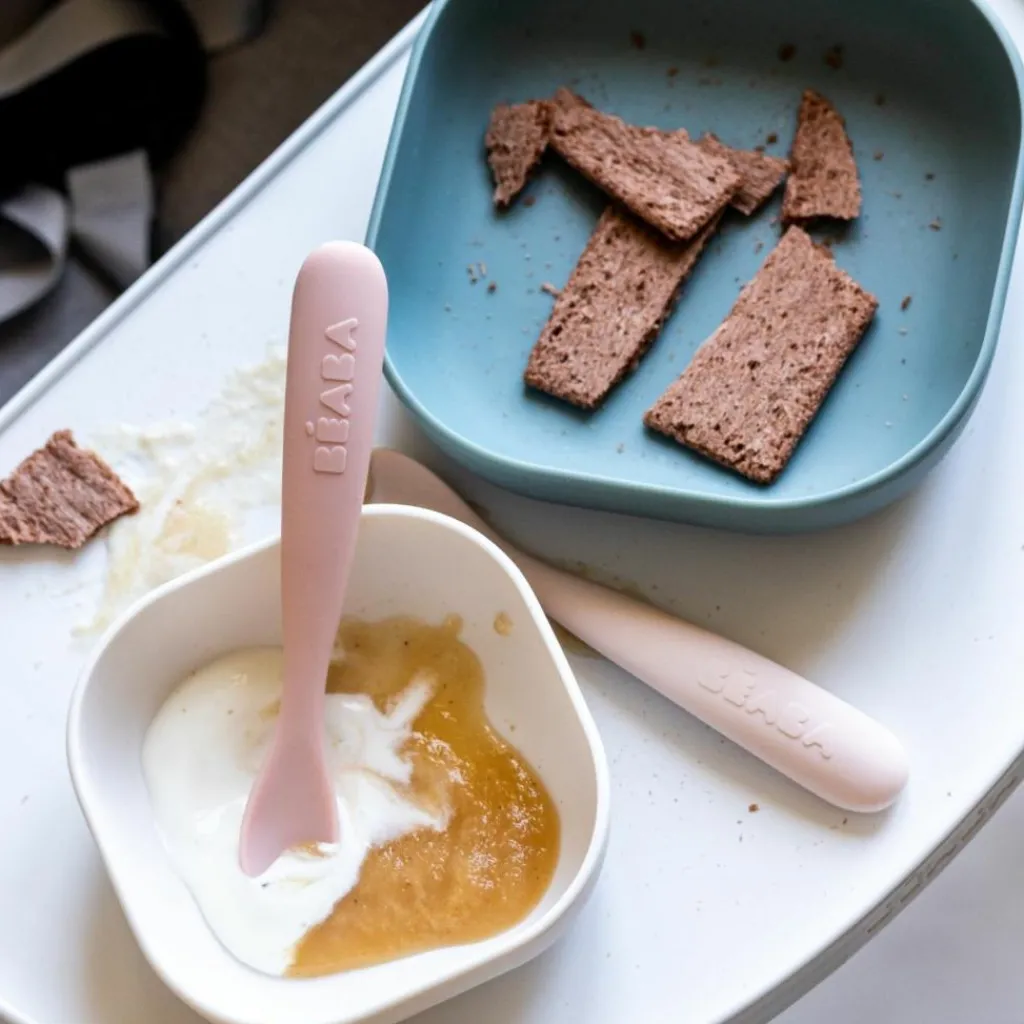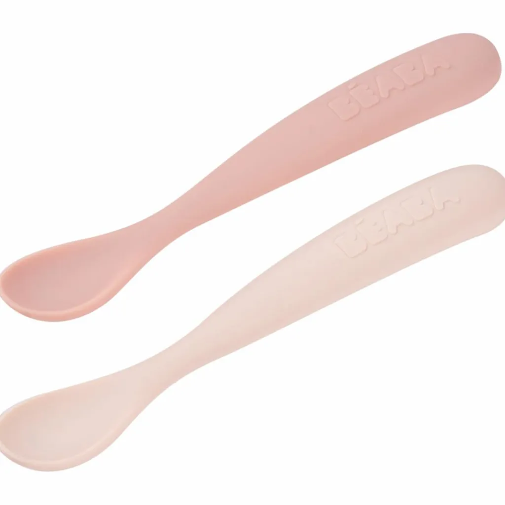 Lot de 2 cuillères silicone 1er âge avec boîte de transport Béaba – l’allié douceur pour les premiers repas de bébé.