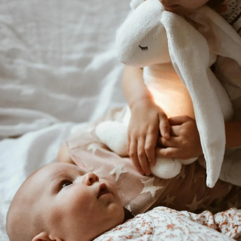 Un compagnon idéal pour le coucher : Adoptez la peluche veilleuse lapin nature bio de Moonie pour des nuits pleines de douceur !