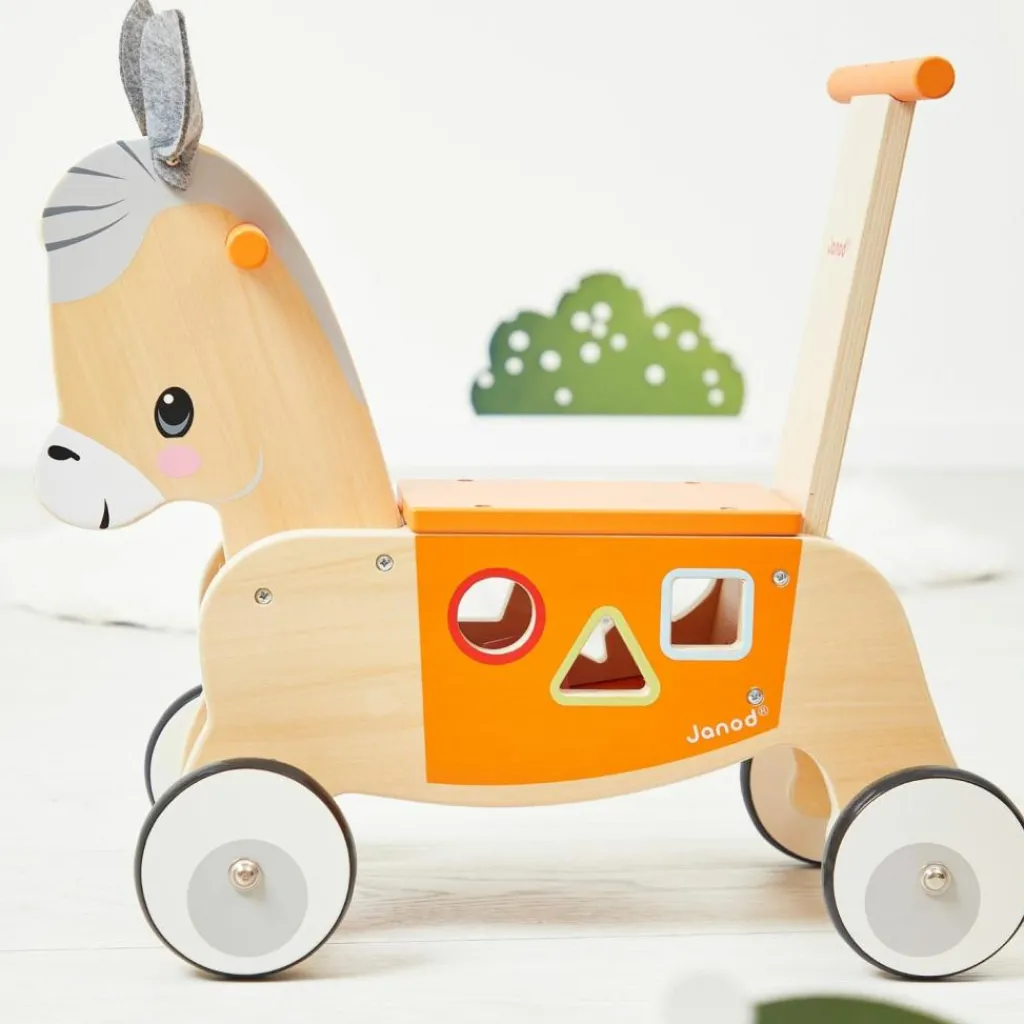 Petit âne au grand cœur, ce porteur en bois attend avec impatience de partir à la découverte du monde avec votre tout-petit. Dès 12 mois, bébé peut le chevaucher ou le pousser à sa guise grâce à la poignée arrière. Un vrai moment de liberté et de découverte, tout en douceur !
