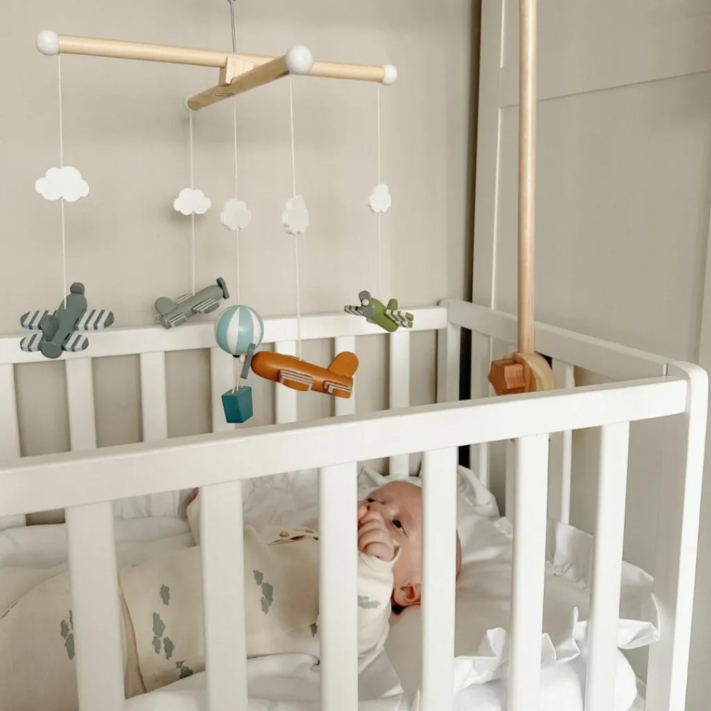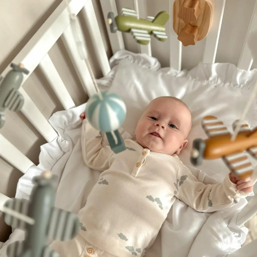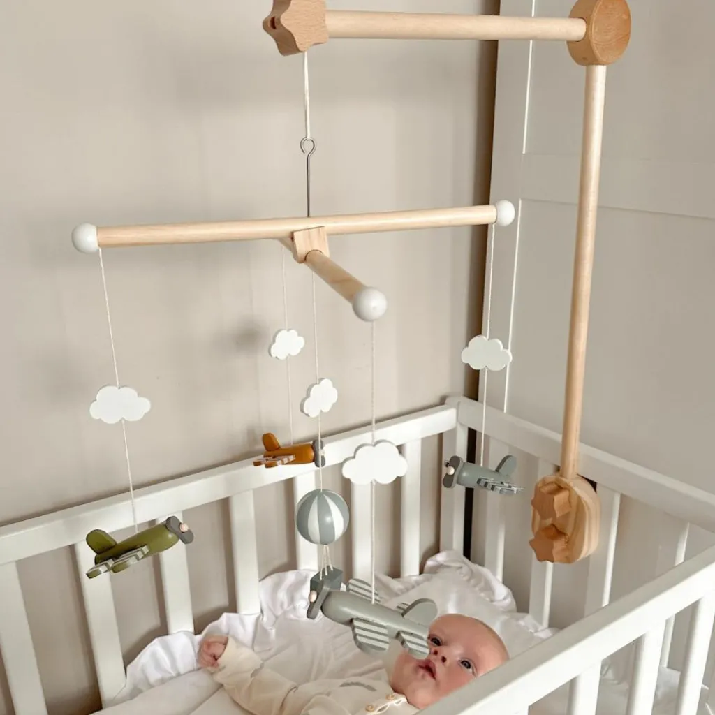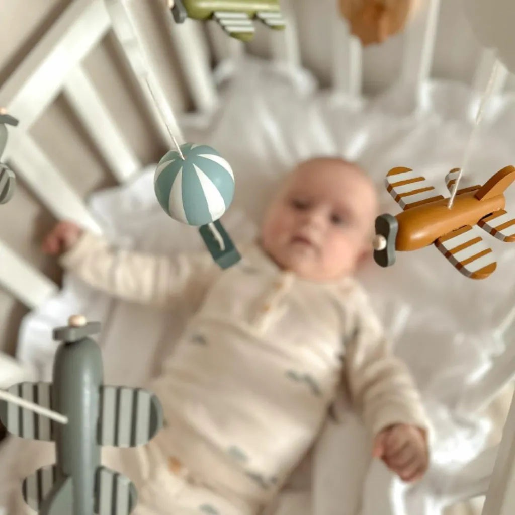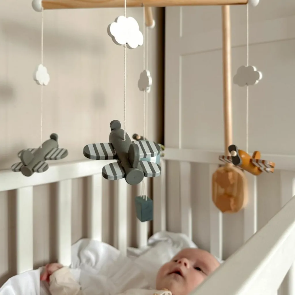 – Mobile en bois décoré de quatre avions colorés, cinq nuages et une montgolfière.