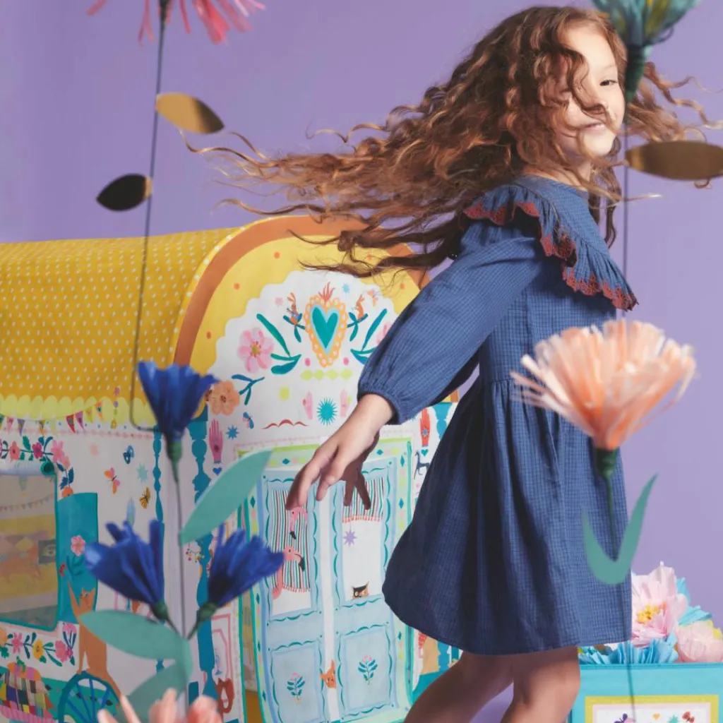 Cette magnifique cabane aux motifs poétiques et colorés évoque l’univers bohème des roulottes de voyageurs. Avec son toit jaune à pois, ses fleurs, ses petits animaux et ses guirlandes illustrées, elle transforme instantanément n’importe quelle pièce en un véritable havre d’aventure. Les enfants adoreront s’y réfugier pour inventer des histoires, lire ou partager des moments secrets avec leurs amis ou leurs peluches.