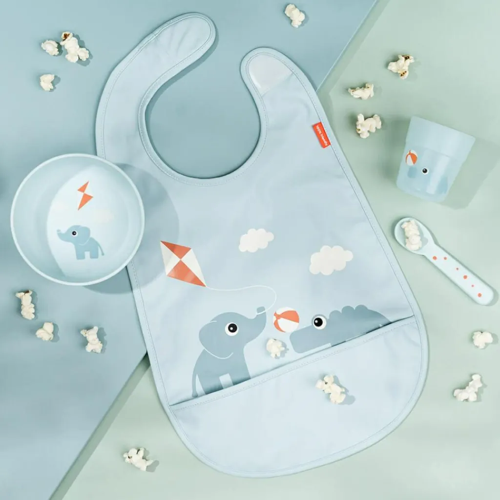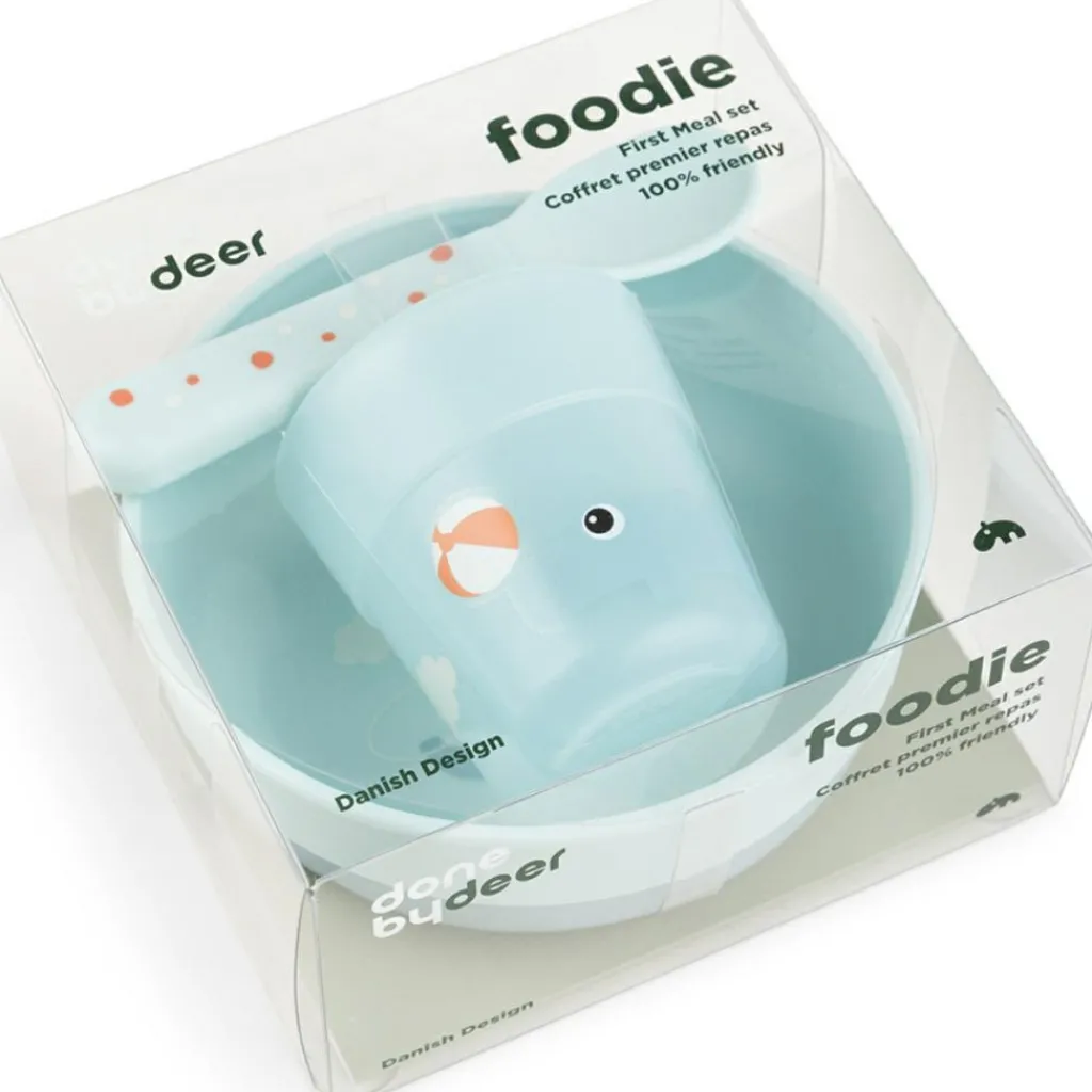 – Coffret bleu contenant un bol, un mini gobelet transparent et une cuillère.