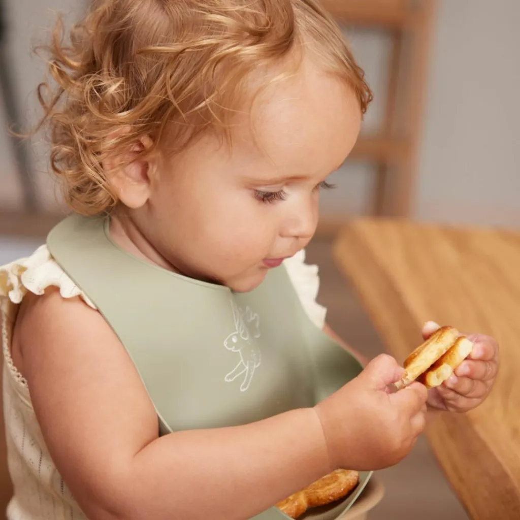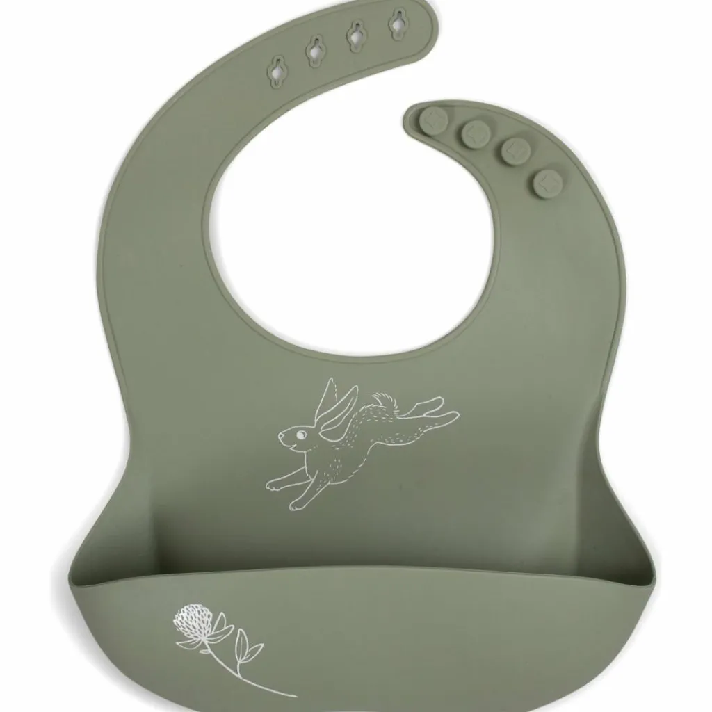 Un repas tout en douceur avec le bavoir silicone Lièvre vert mousse de Filibabba.
