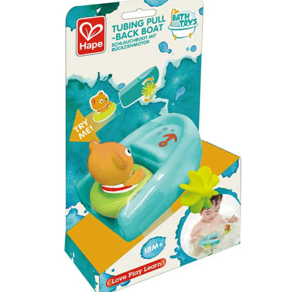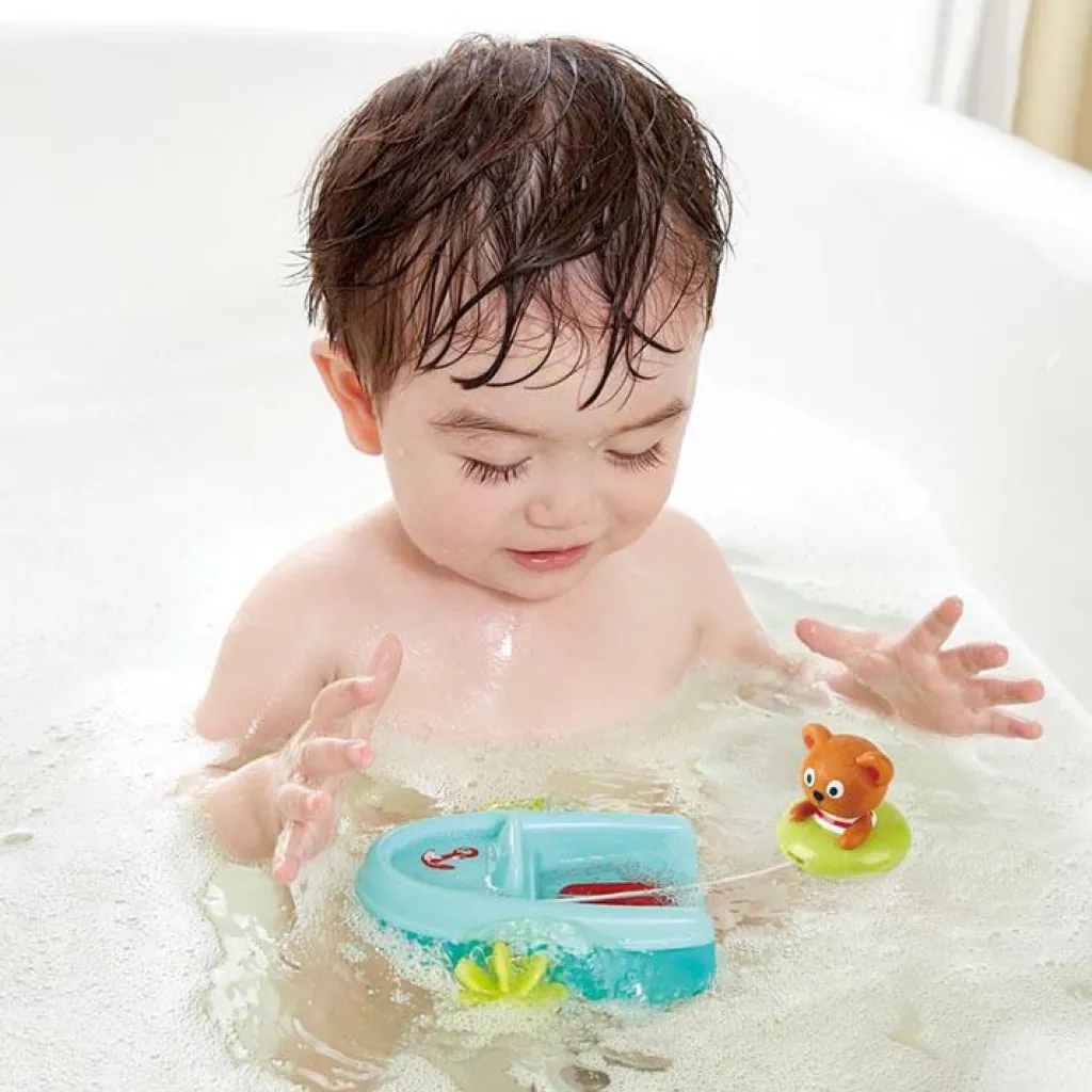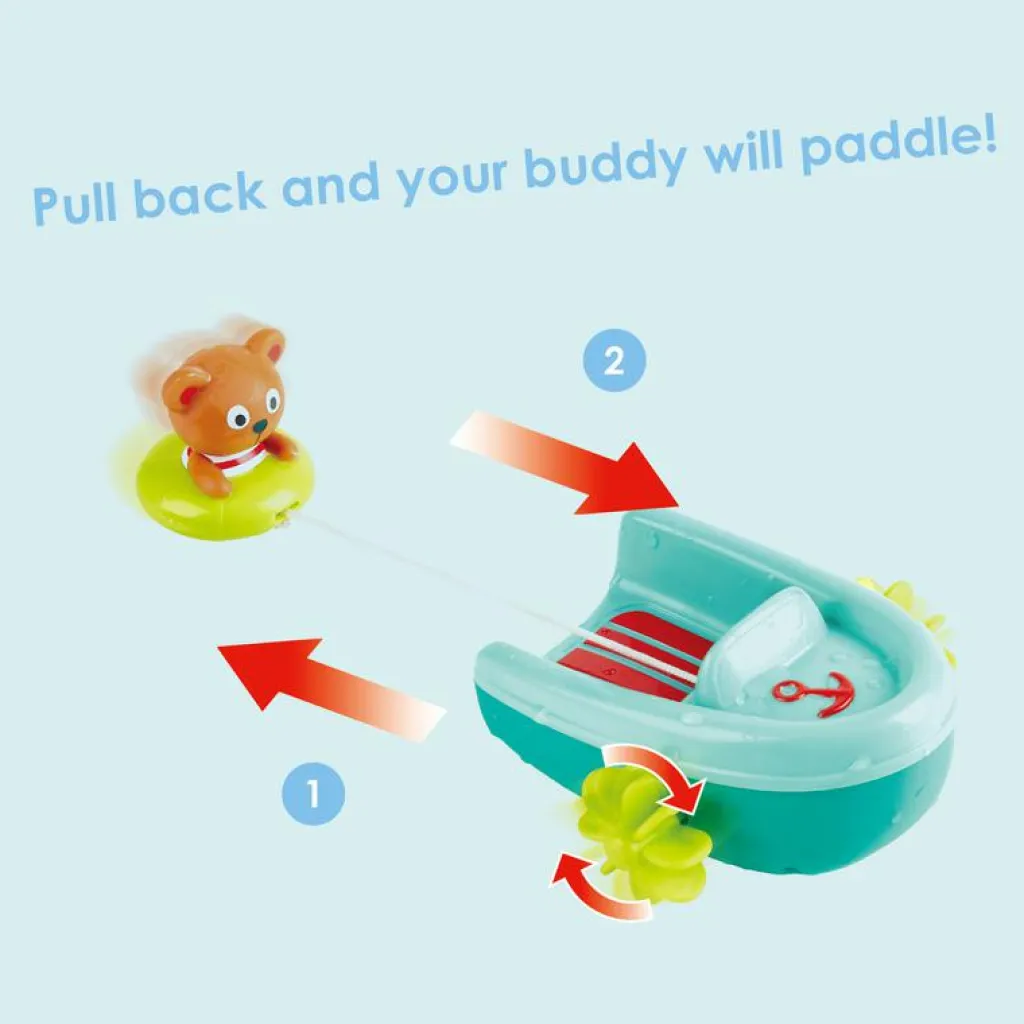– Tirez le nounours dans sa bouée de sauvetage vers l’arrière pour faire avancer le bateau dans l’eau. Il s’arrêtera lorsque l’ours atteindra de nouveau le bateau.Le bateau est propulsé par de petites hélices sur les côtés qui font de petites éclaboussures et laissent un joli sillage dans l’eau en tournant.