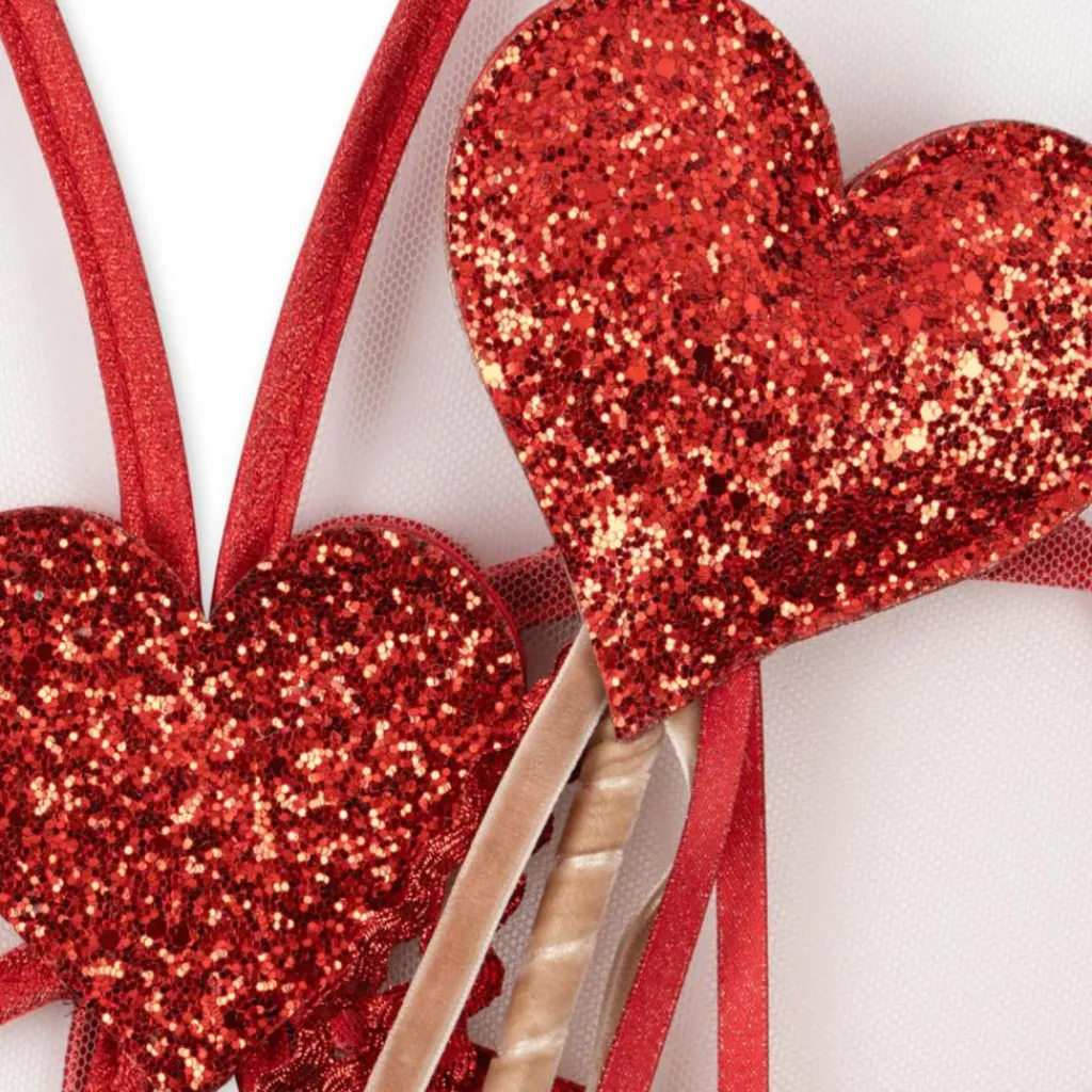 – Décoration en cœurs pailletés rouges.