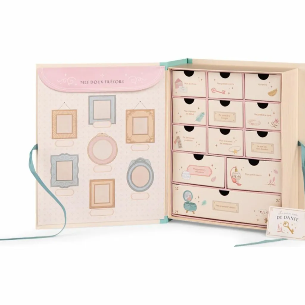 – Coffret à trésors pour ranger dans chacun des tiroirs toutes les douceurs de l’enfance, illustré il met en scène les personnages de la Petite école de danse.