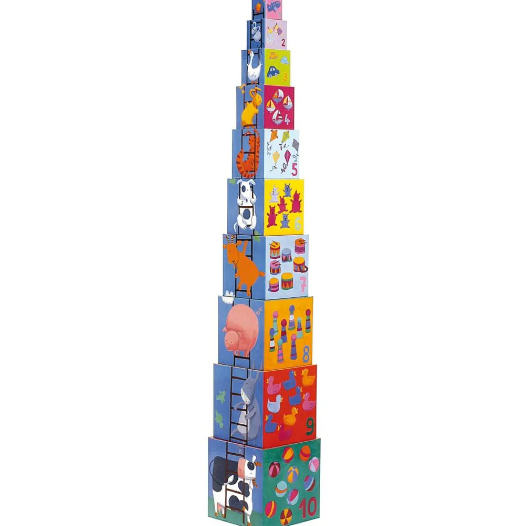 Ce jeu de cubes empilables Rigolo par Djeco est composé de 10 cubes illustrés sur leur 5 faces par des animaux, des formes géométriques, des chiffres, les différents moments de la journée et sur la dernière face par des animaux montant à l’échelle !