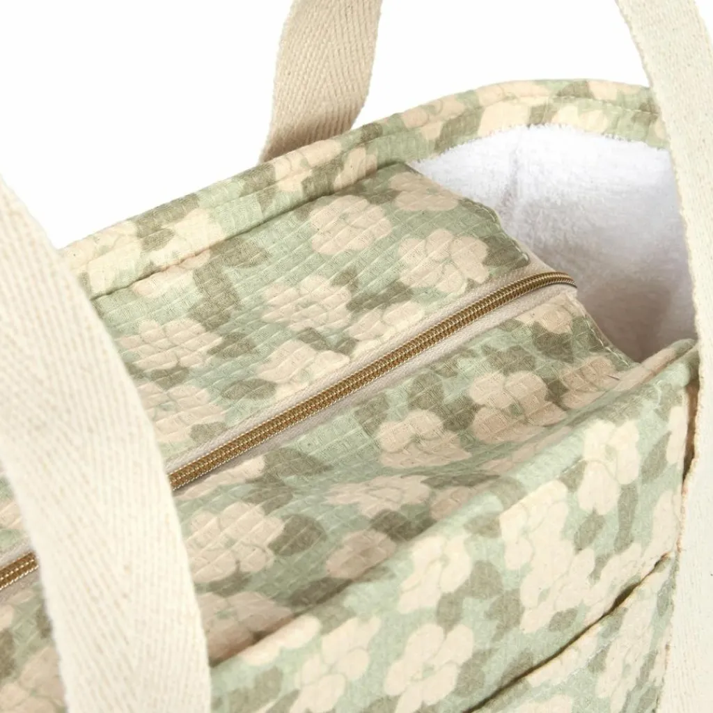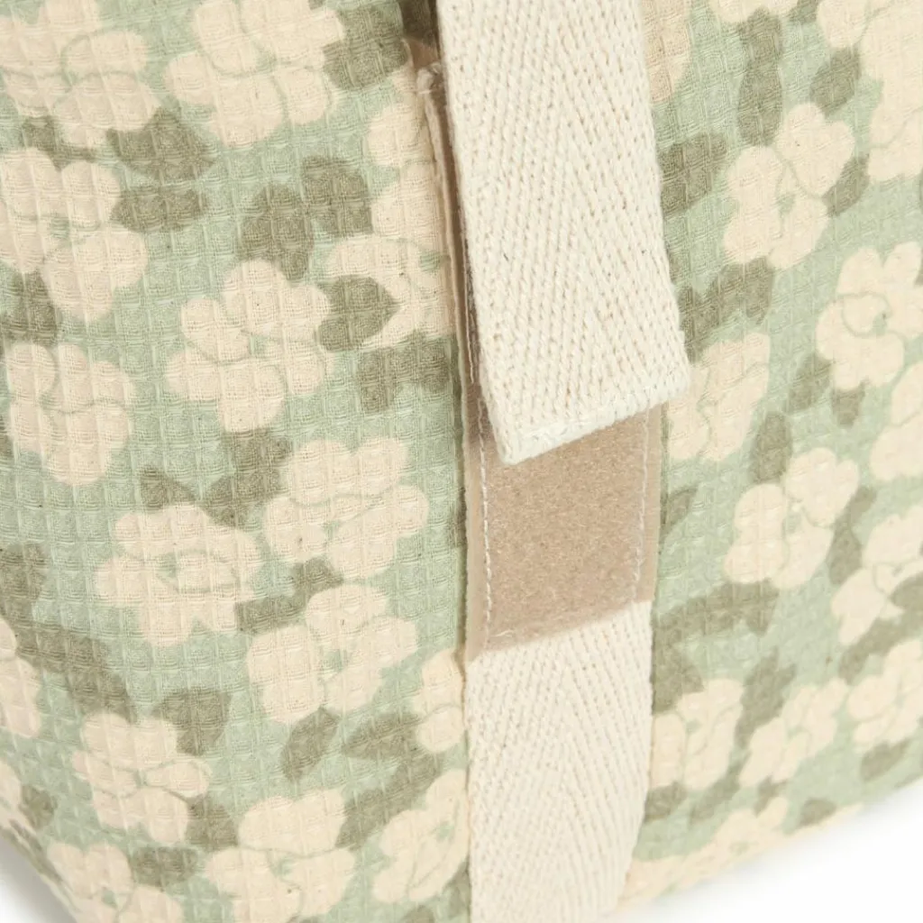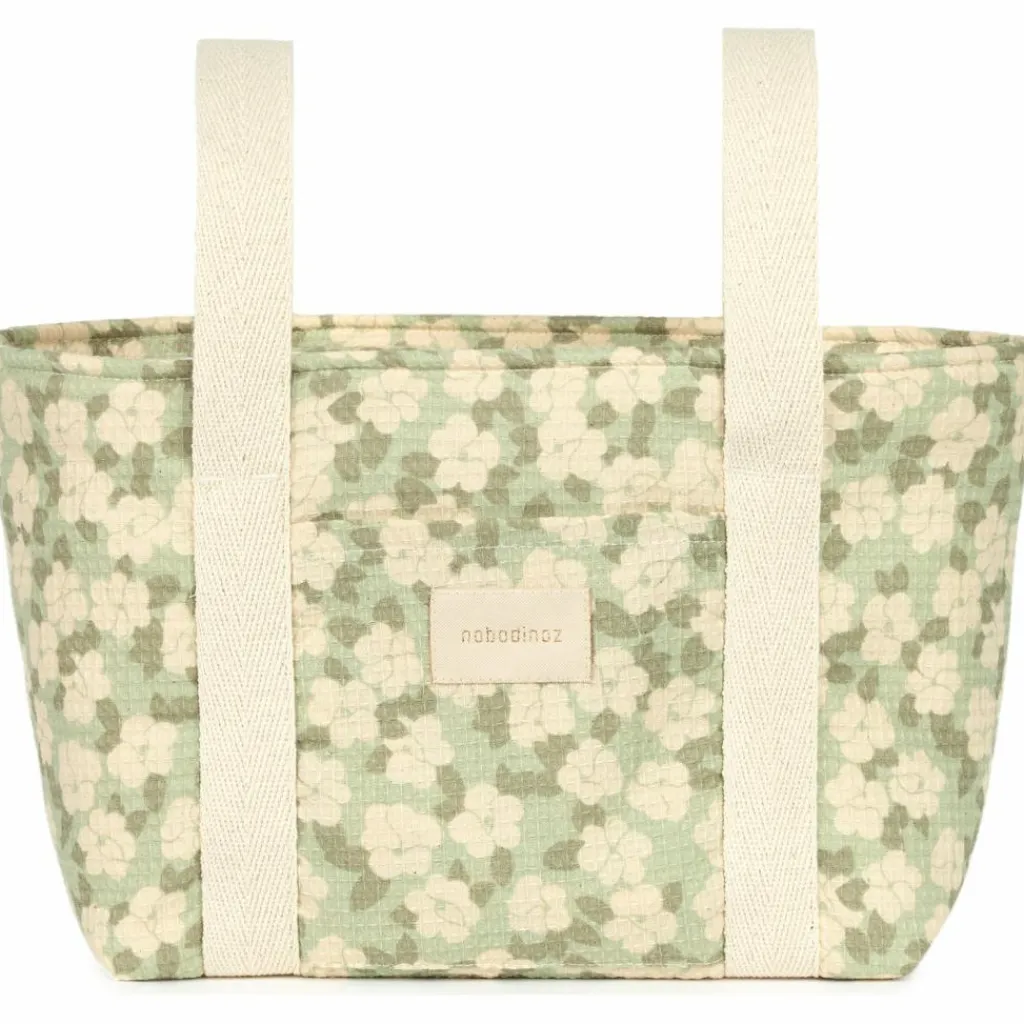 – Extérieur : sergé de coton bio imprimé et matelassé.