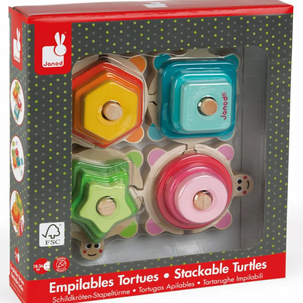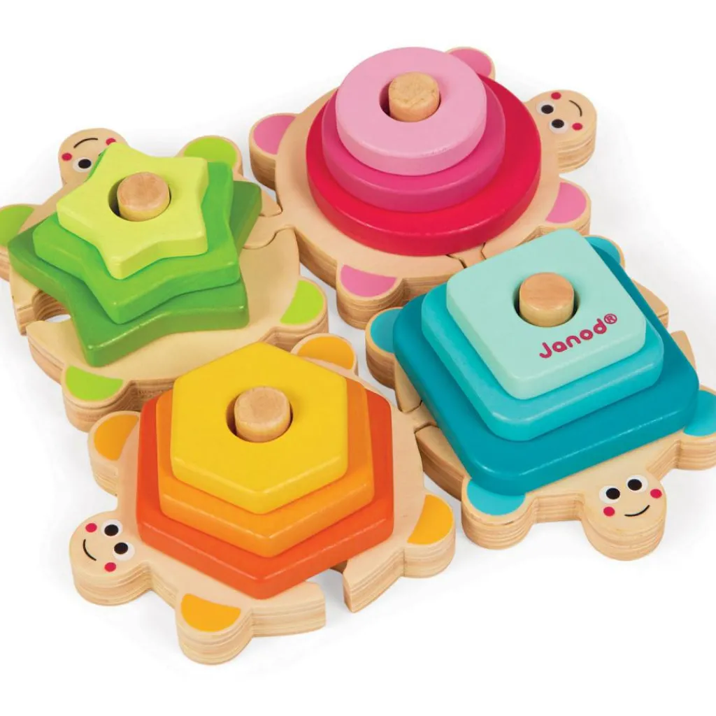 Ce jeu tortues à empiler I wood de la marque Janod permet à l’enfant d’apprendre les couleurs et les formes tout en s’amusant.