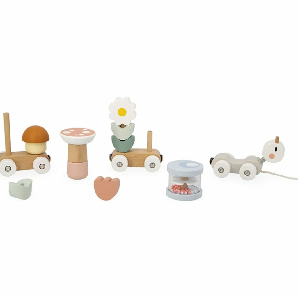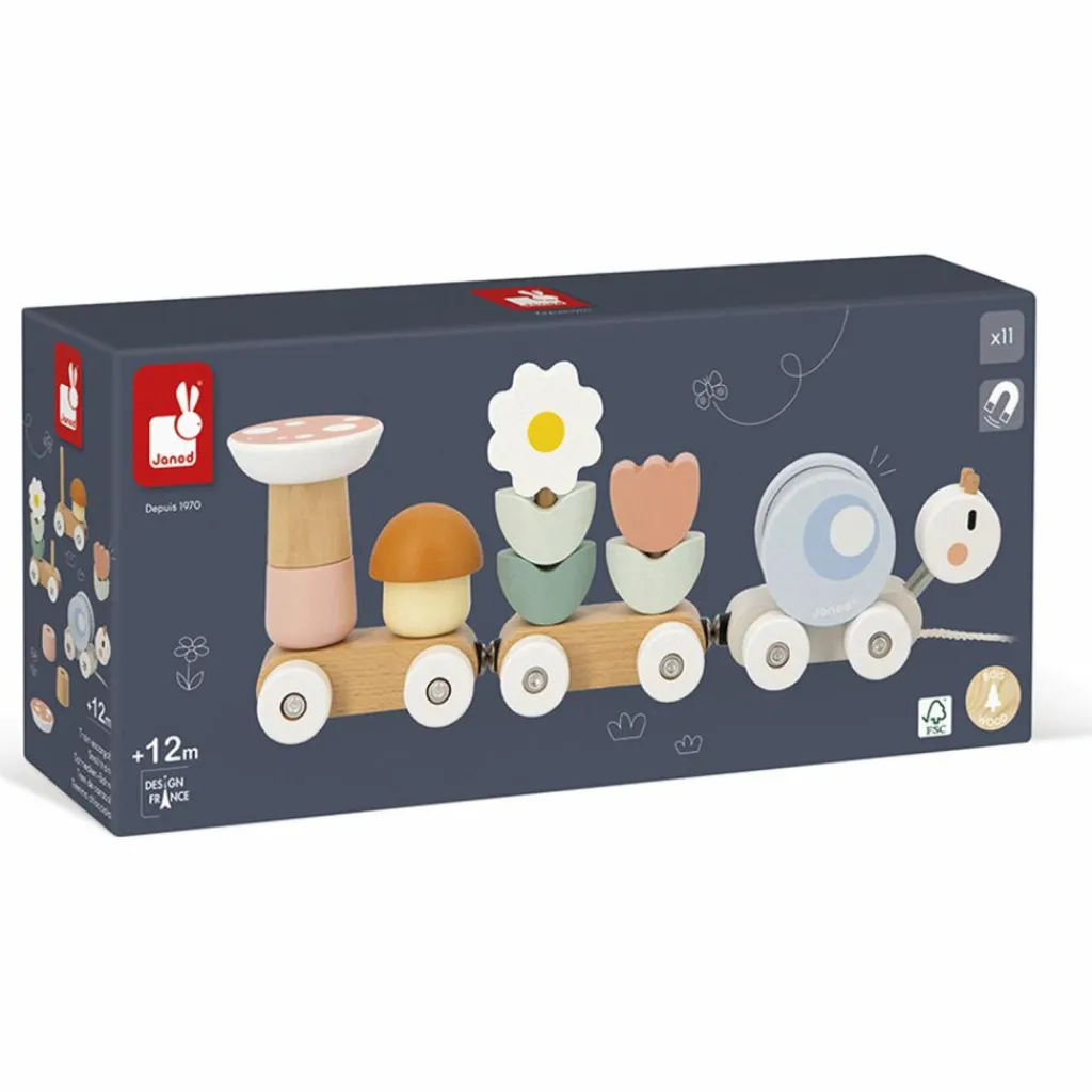 Les formes variées (champignons, fleurs…) invitent bébé à manipuler, réfléchir, créer. Et au fil de ses explorations, il découvre une belle surprise : le premier wagon est un escargot… dont la coquille est un hochet à billes transparent ! Il peut le secouer pour éveiller son ouïe, observer les billes bouger pour stimuler sa vue, et le voir rouler lorsqu’il est posé sur le dos du petit escargot en mouvement.