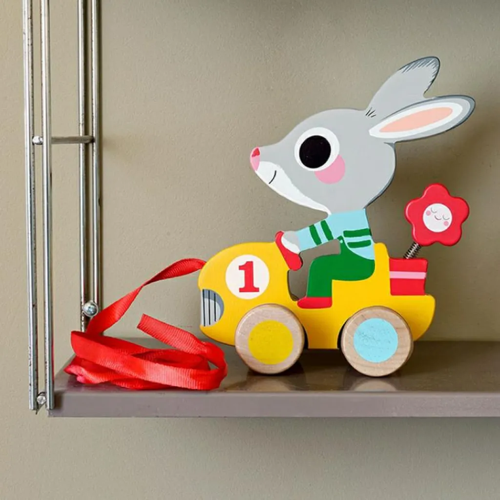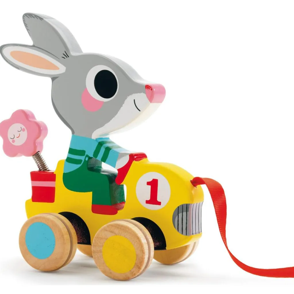 Le jouet à tirer Roulapic de la marque Djeco accompagnera le bébé lors de ses premiers pas.
