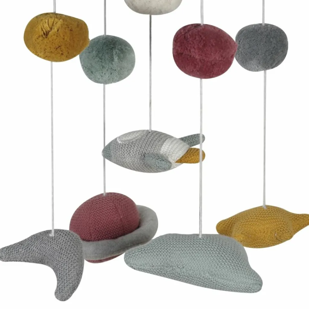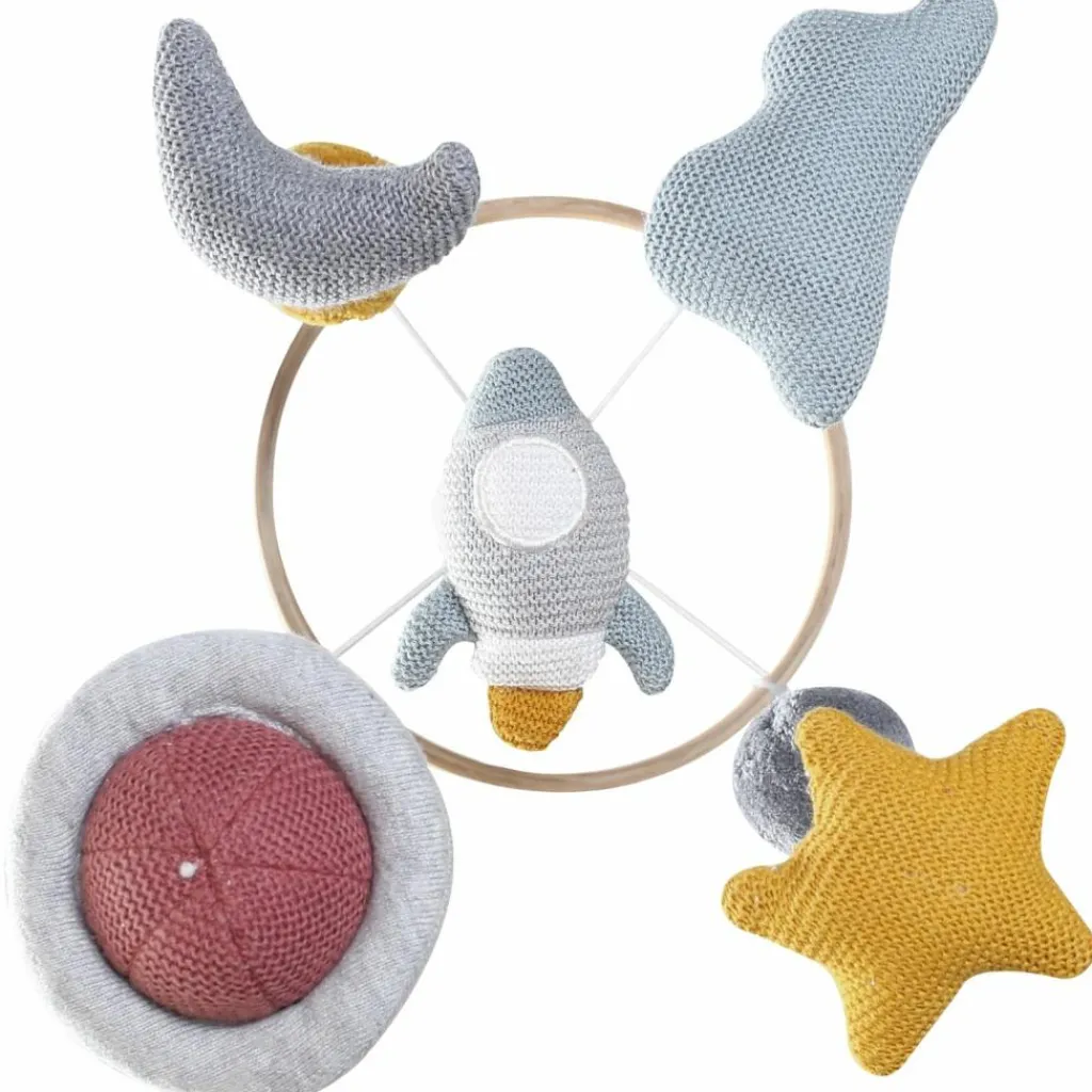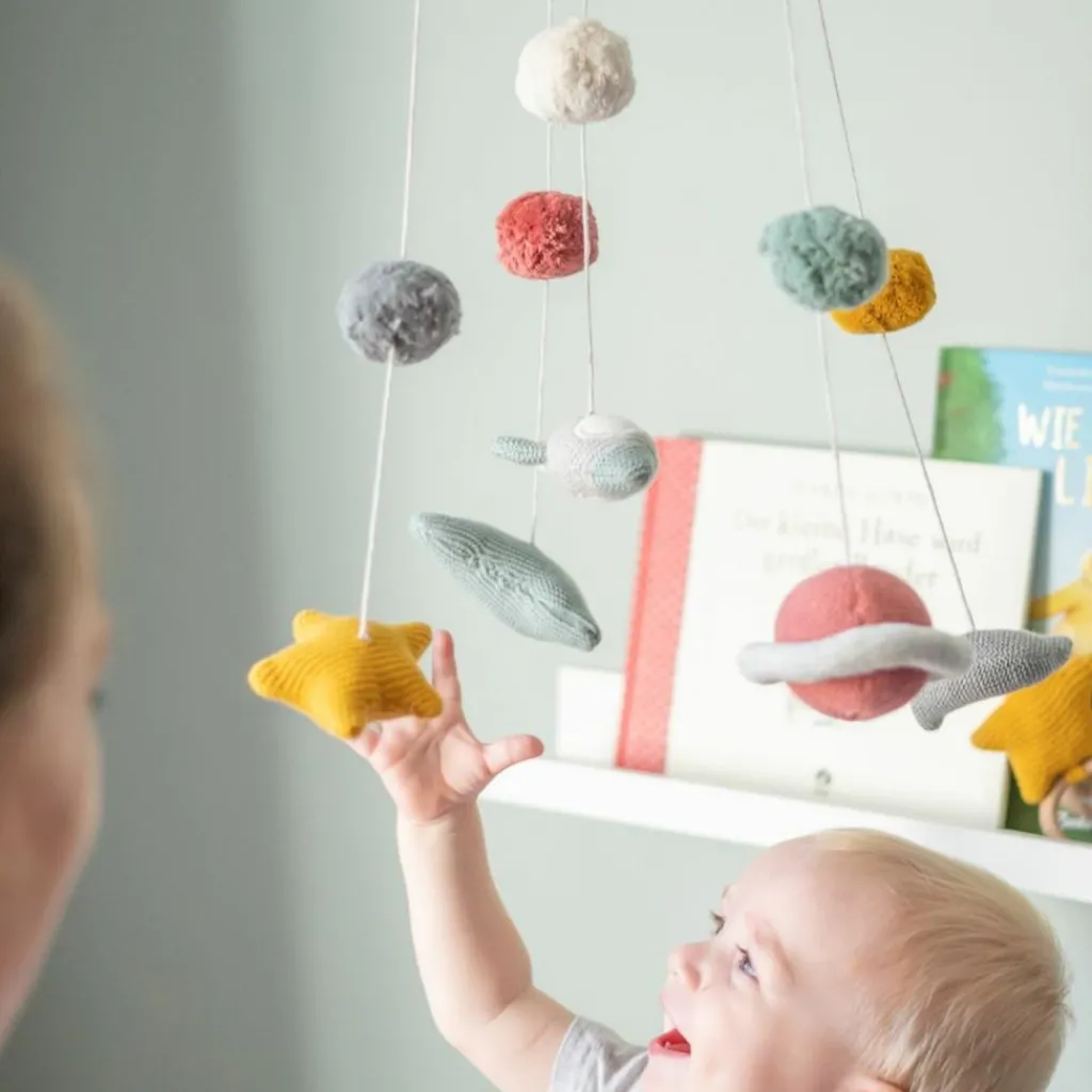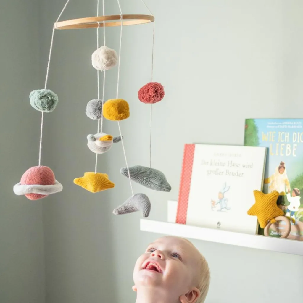 – Le mobile sert à la stimulation visuelle et doit être fixé hors de portée de l’enfant.