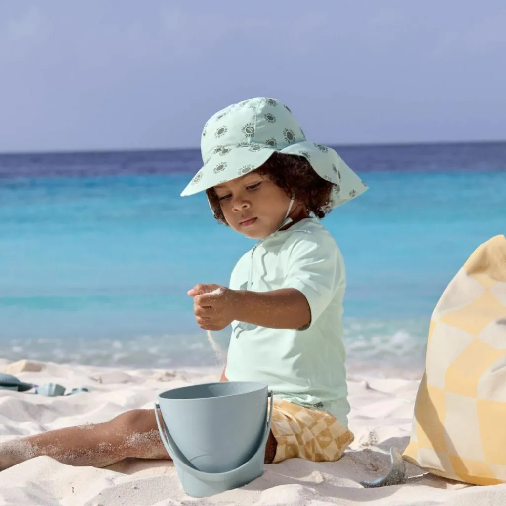 – Protection contre les rayons UV à terre ou dans l’eau en association avec la crème solaire et le slip de bain et le chapeau anti-UV assortis