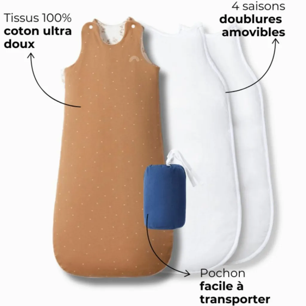 Pensée pour accompagner bébé tout au long de l’année, cette gigoteuse ingénieuse s’adapte à toutes les températures grâce à ses 2 doublures amovibles. Passez facilement d’un TOG 3 pour l’hiver à un TOG 1 pour l’été, en ajustant simplement les couches selon la saison. Pratique et évolutive, elle devient vite un indispensable du sommeil de bébé.