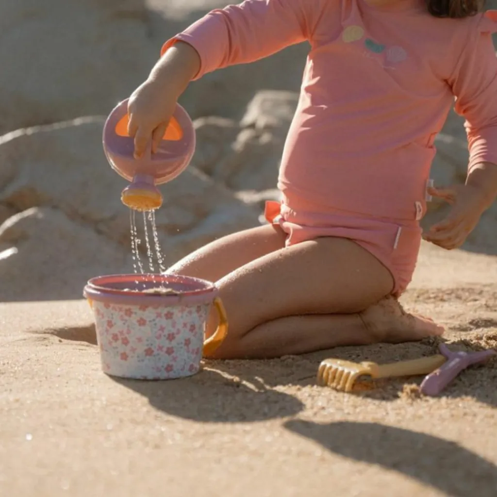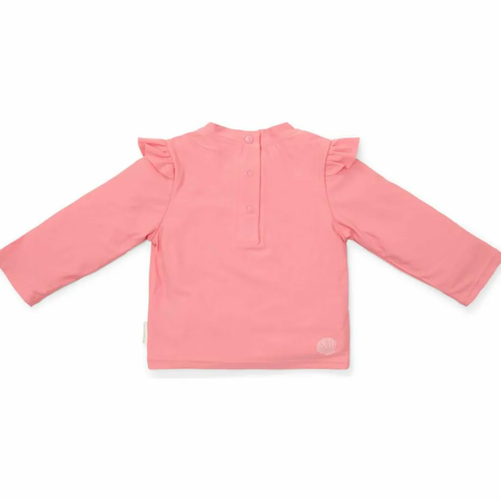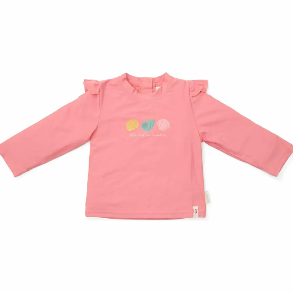– Le maillot de natation Ocean Treasures à manches longues présente une belle teinte rose agrémentée de motifs coquillages et de volants élégants aux épaules.