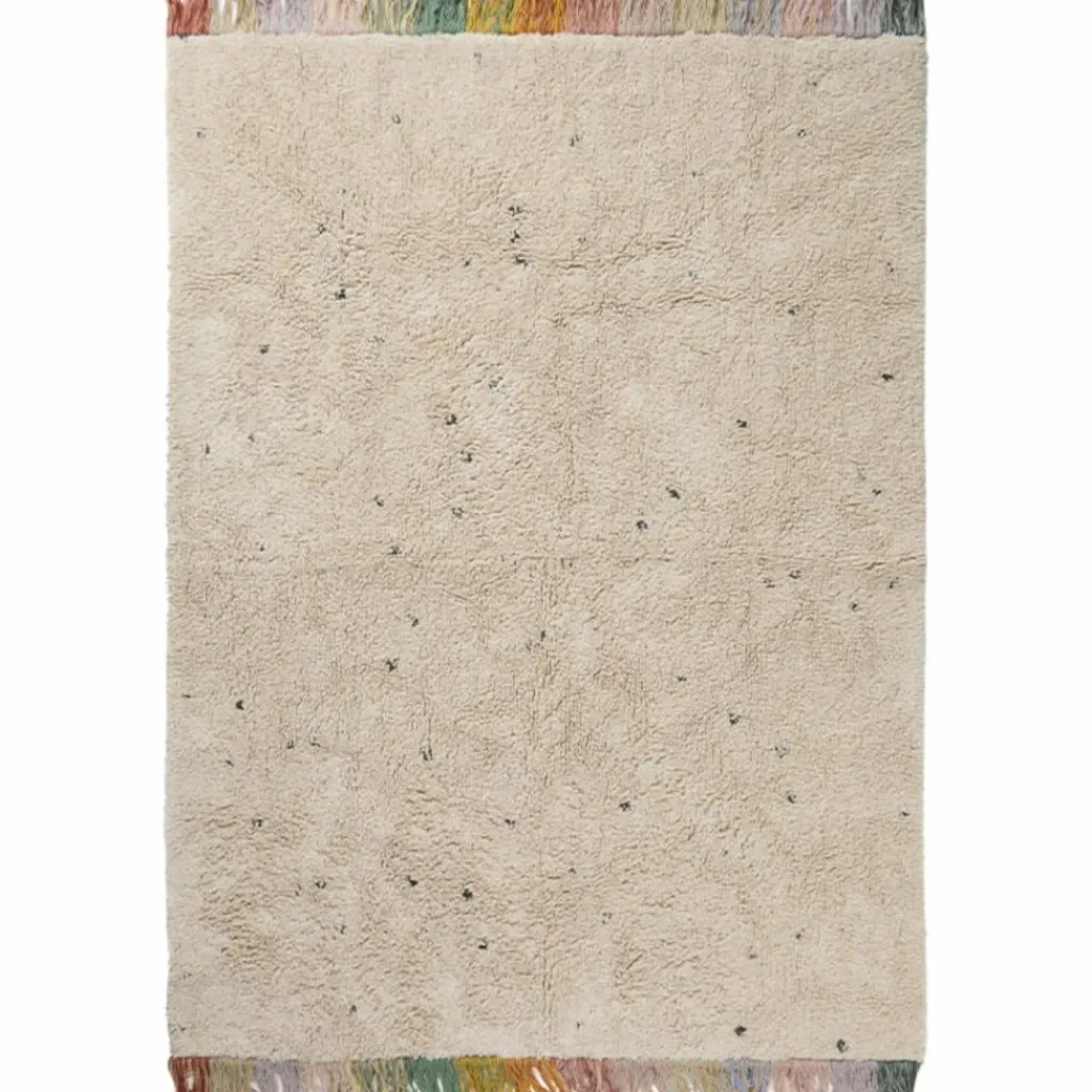 – Un tapis rectangulaire en coton fait à la main de couleur naturelle avec de petits points sombres simulant la poussière d’étoiles dans le vaste espace.