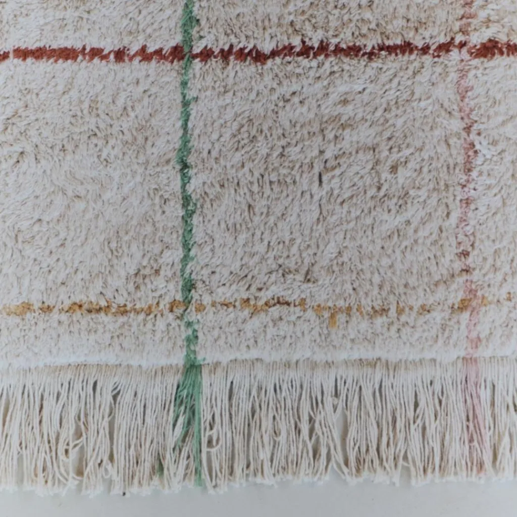 – Tapis naturel rectangulaire avec des lignes de différentes couleurs, terminé par de courtes franges sur les bords.