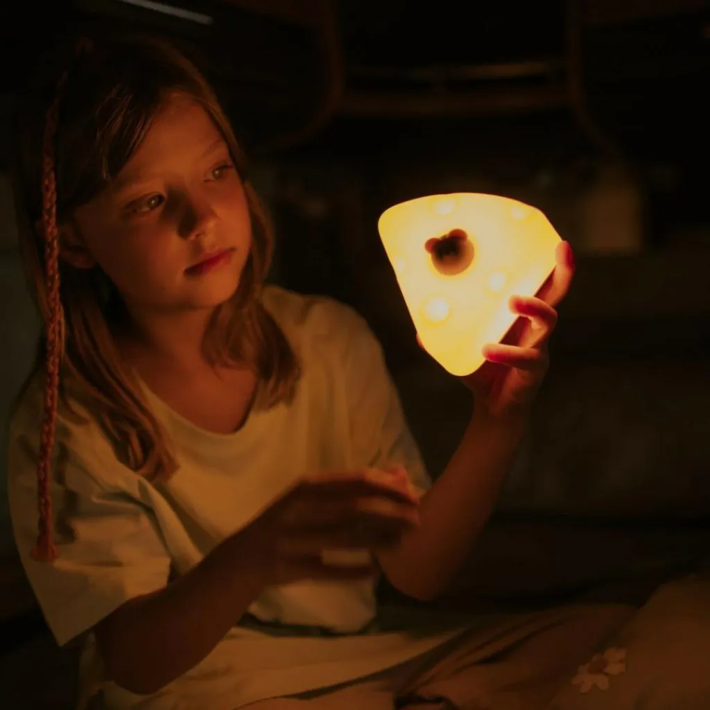 Apportez une touche d’humour et de tendresse à vos soirées avec la veilleuse rechargeable Fromage avec Souris de Mary’s.