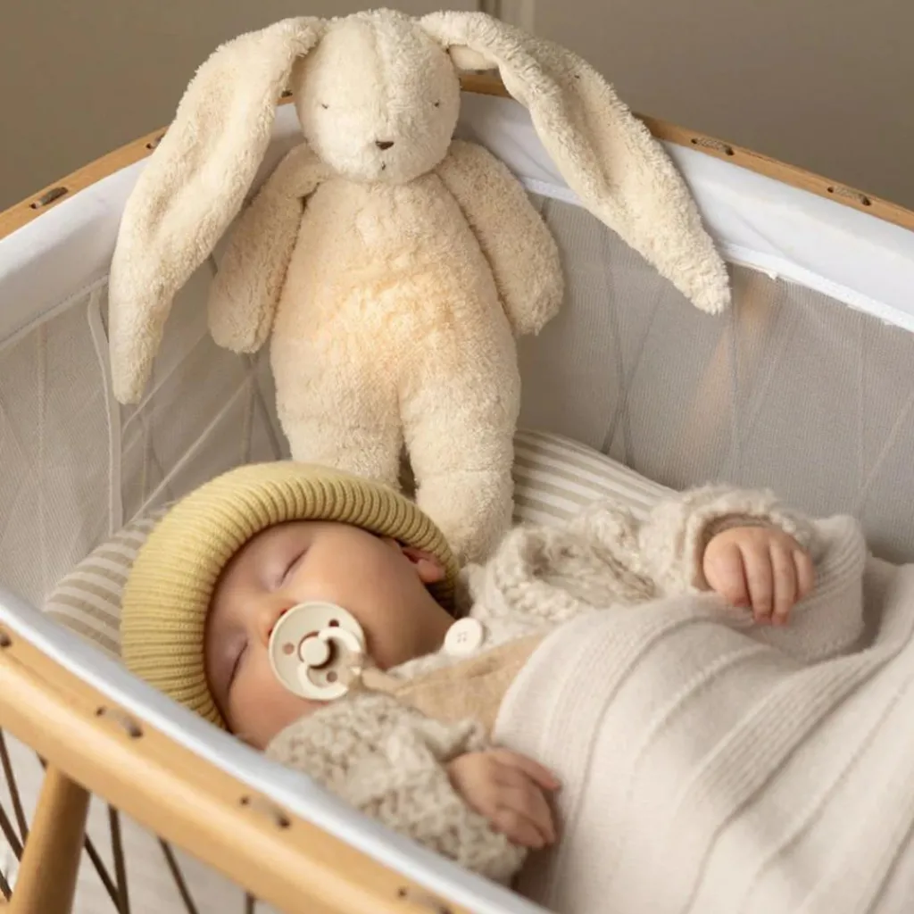 Un compagnon idéal pour le coucher : Adoptez la peluche veilleuse lapin nature bio de Moonie pour des nuits pleines de douceur !