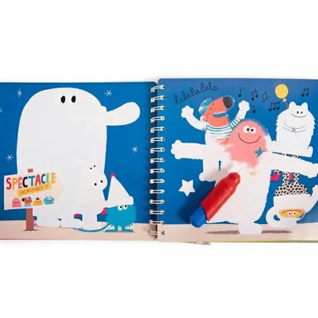 – Grâce à un pinceau magique avec réservoir d’eau, peindre les zones blanches sur chaque page pour faire apparaître comme par magie les illustrations.