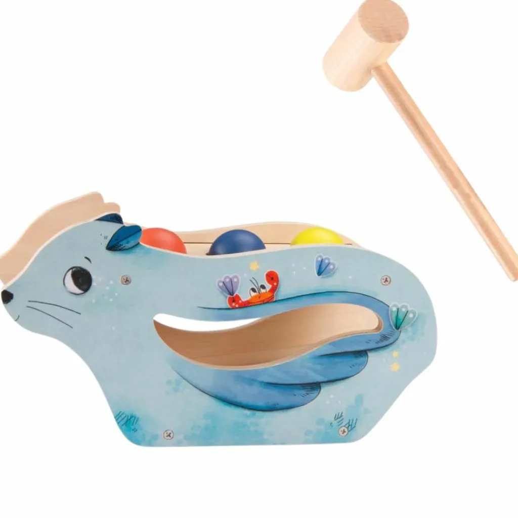– À l’aide du petit marteau, taper sur les boules de couleur.
