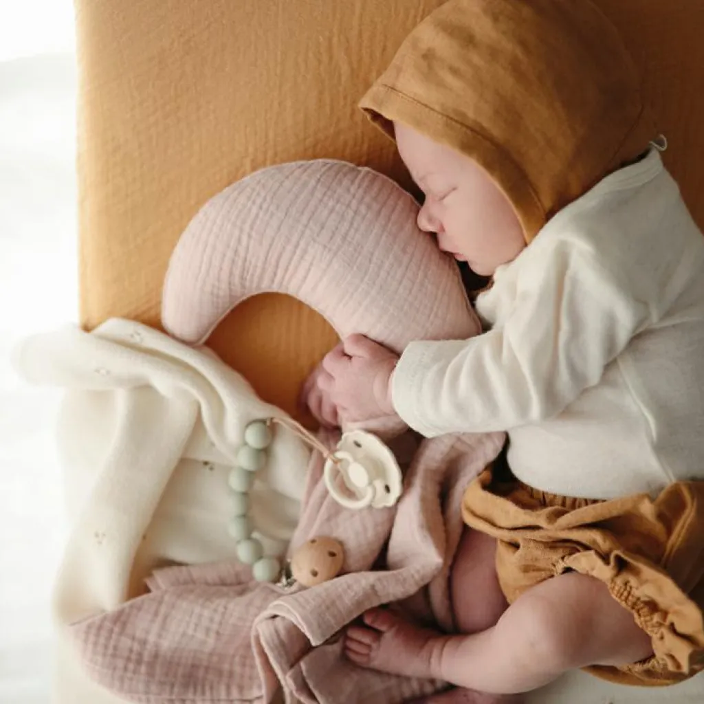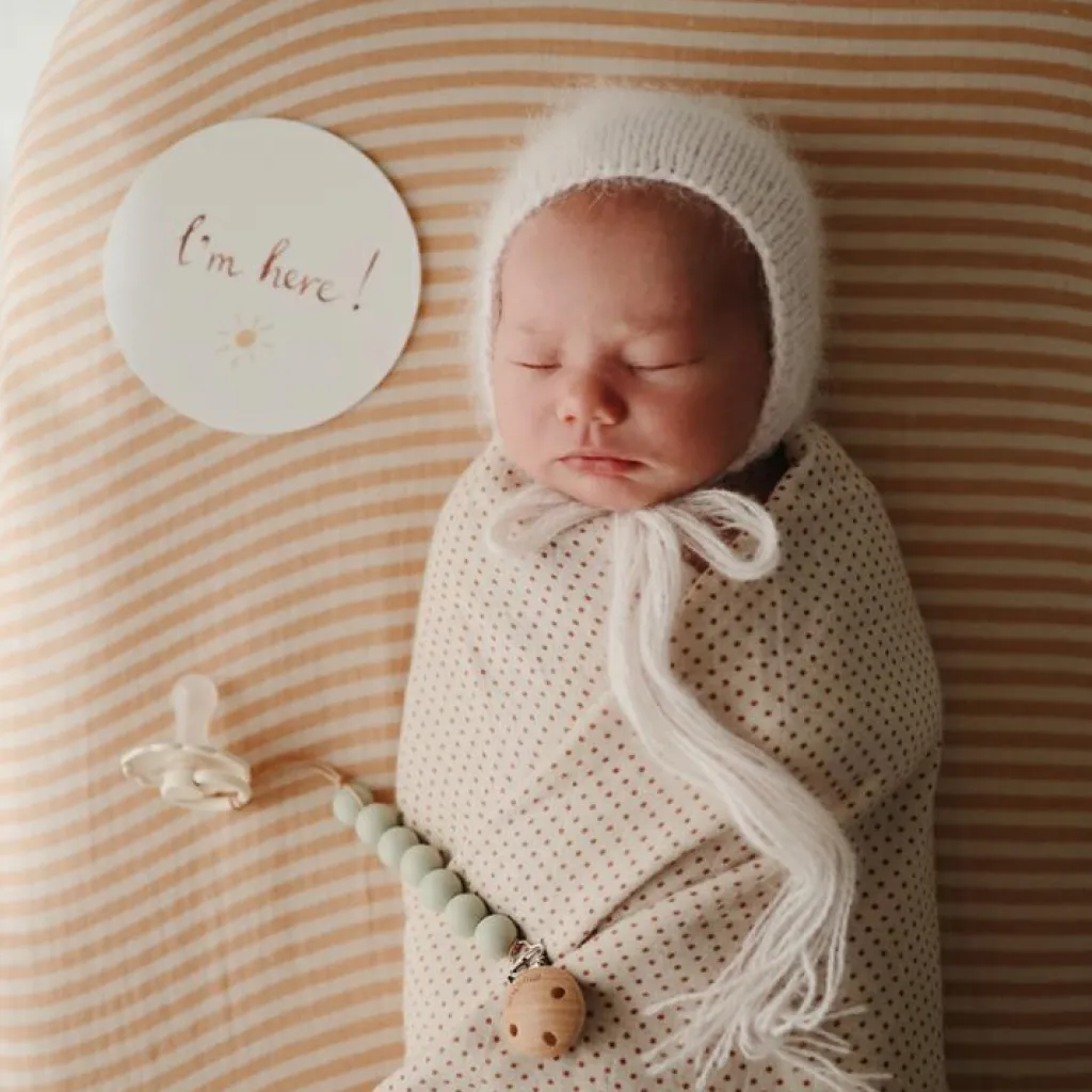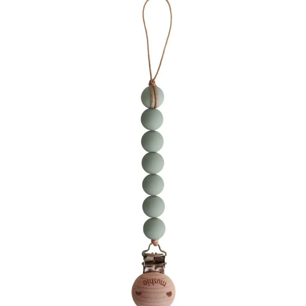 – Clip en bois et métal à accrocher aux vêtements de bébé.