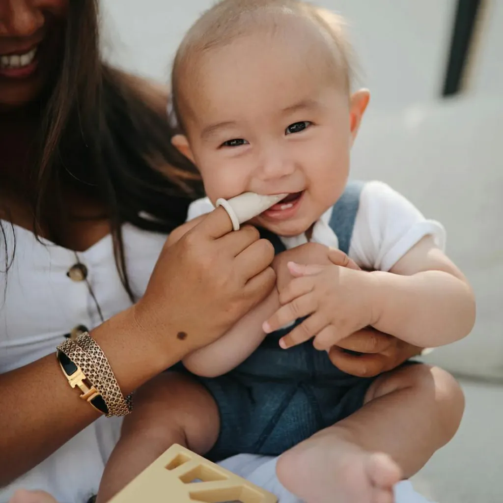Faites de l’hygiène bucco-dentaire un moment doux et rassurant avec le lot de 2 brosses à dents à doigt Shifting Sand-Blush de Mushie.