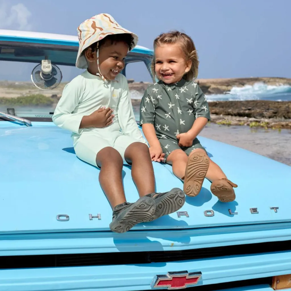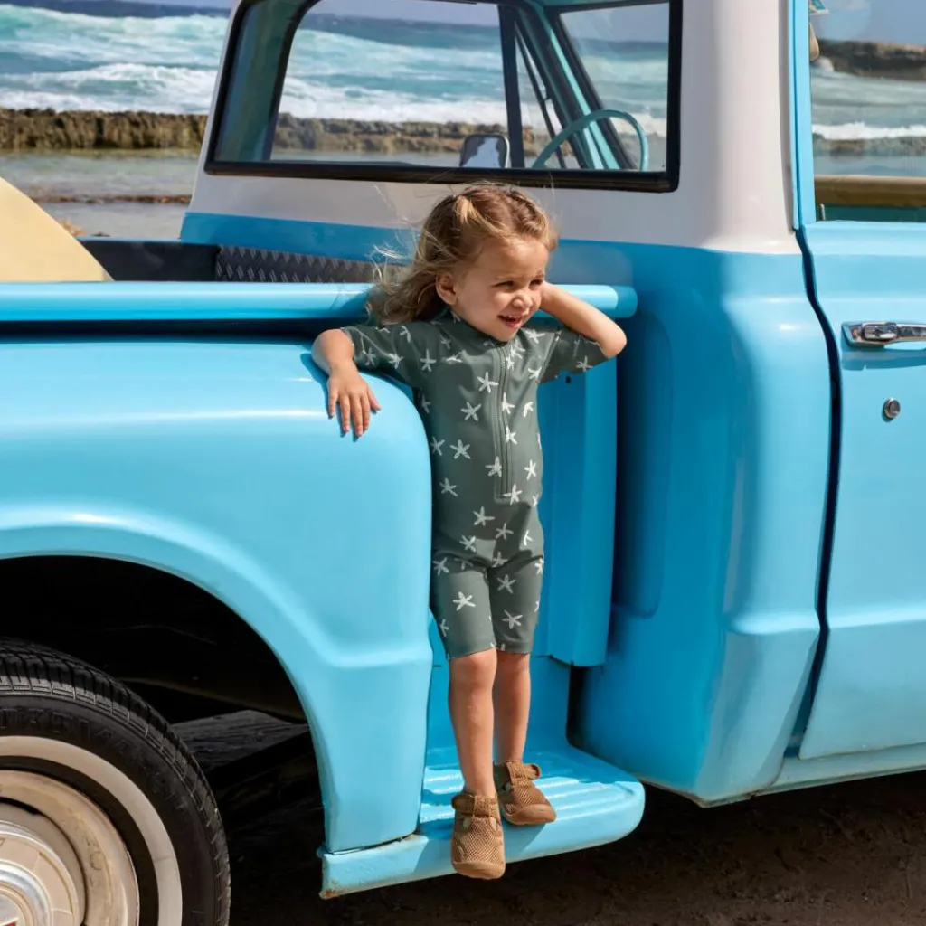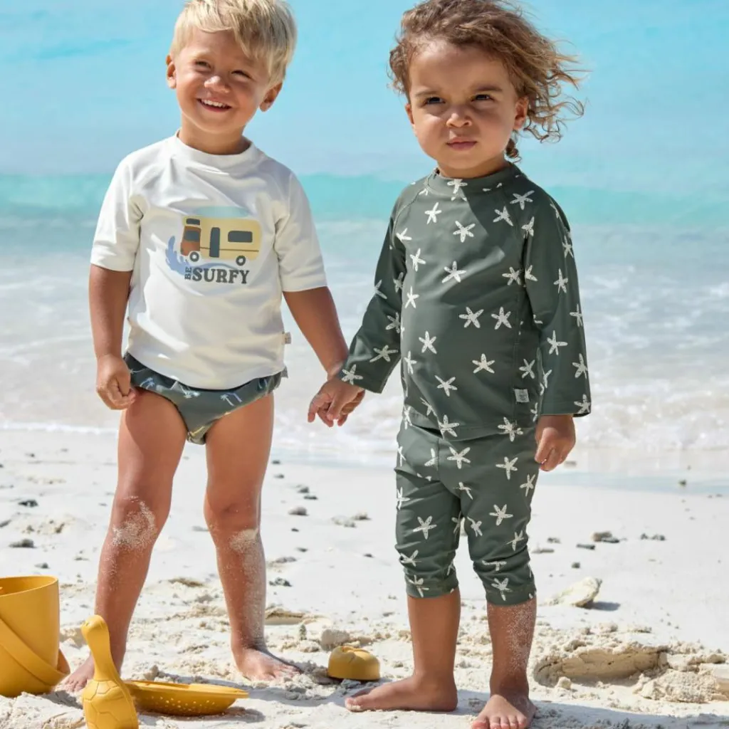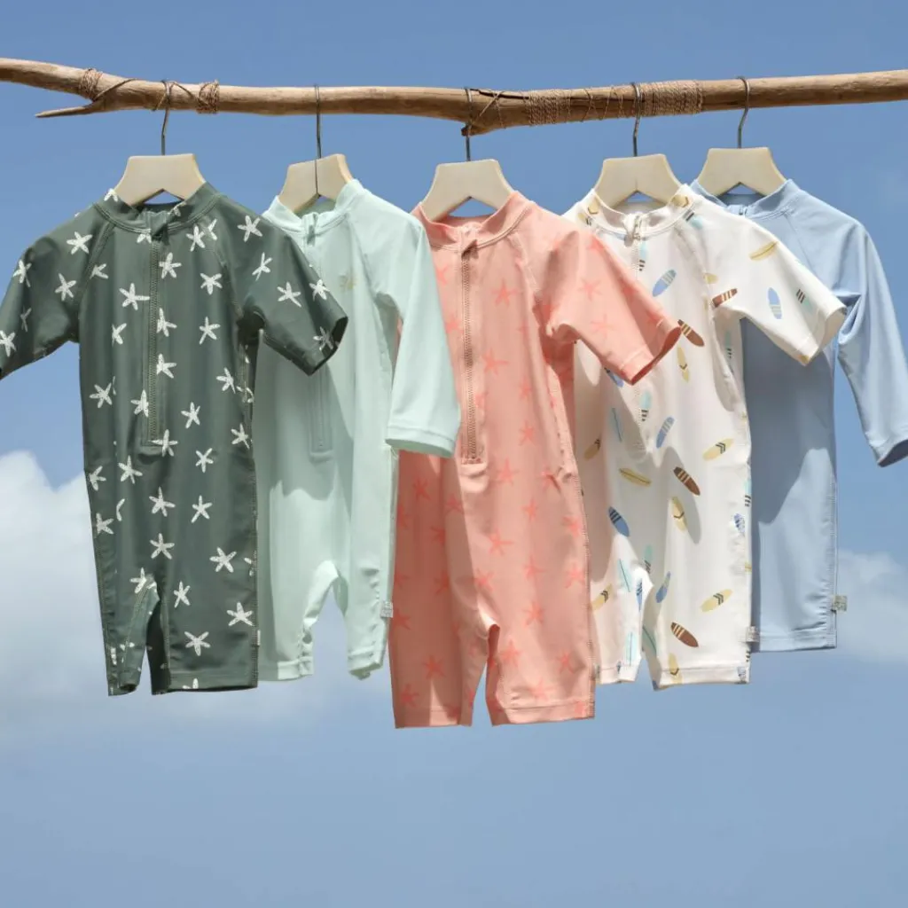 – Avis aux petits surfeurs ! En combinaison à manches courtes avec un indice de protection UV 60, plus rien n’empêche la prochaine baignade.