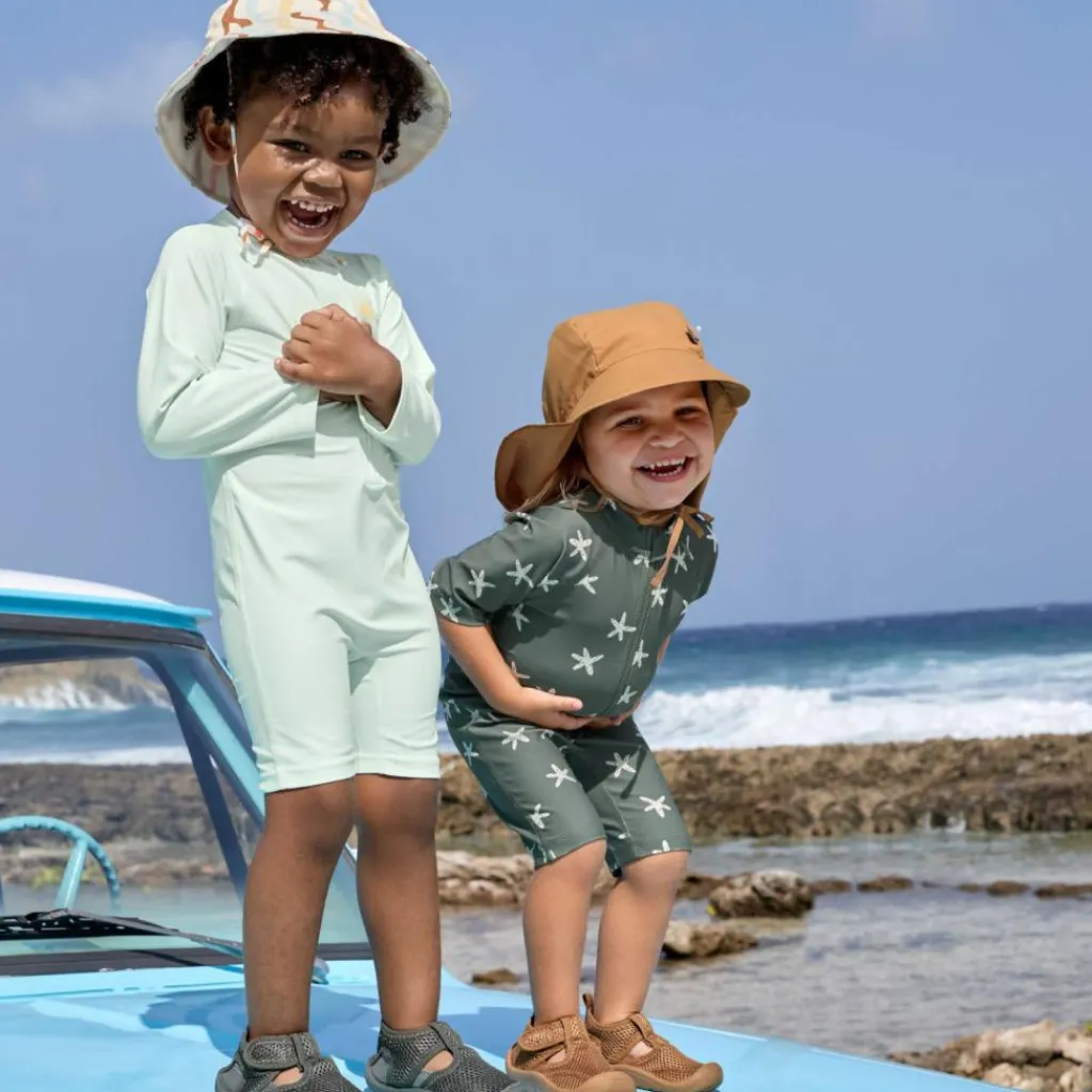 – Protection contre les rayons UV à terre ou dans l’eau en association avec la crème solaire et le chapeau anti-UV assorti.