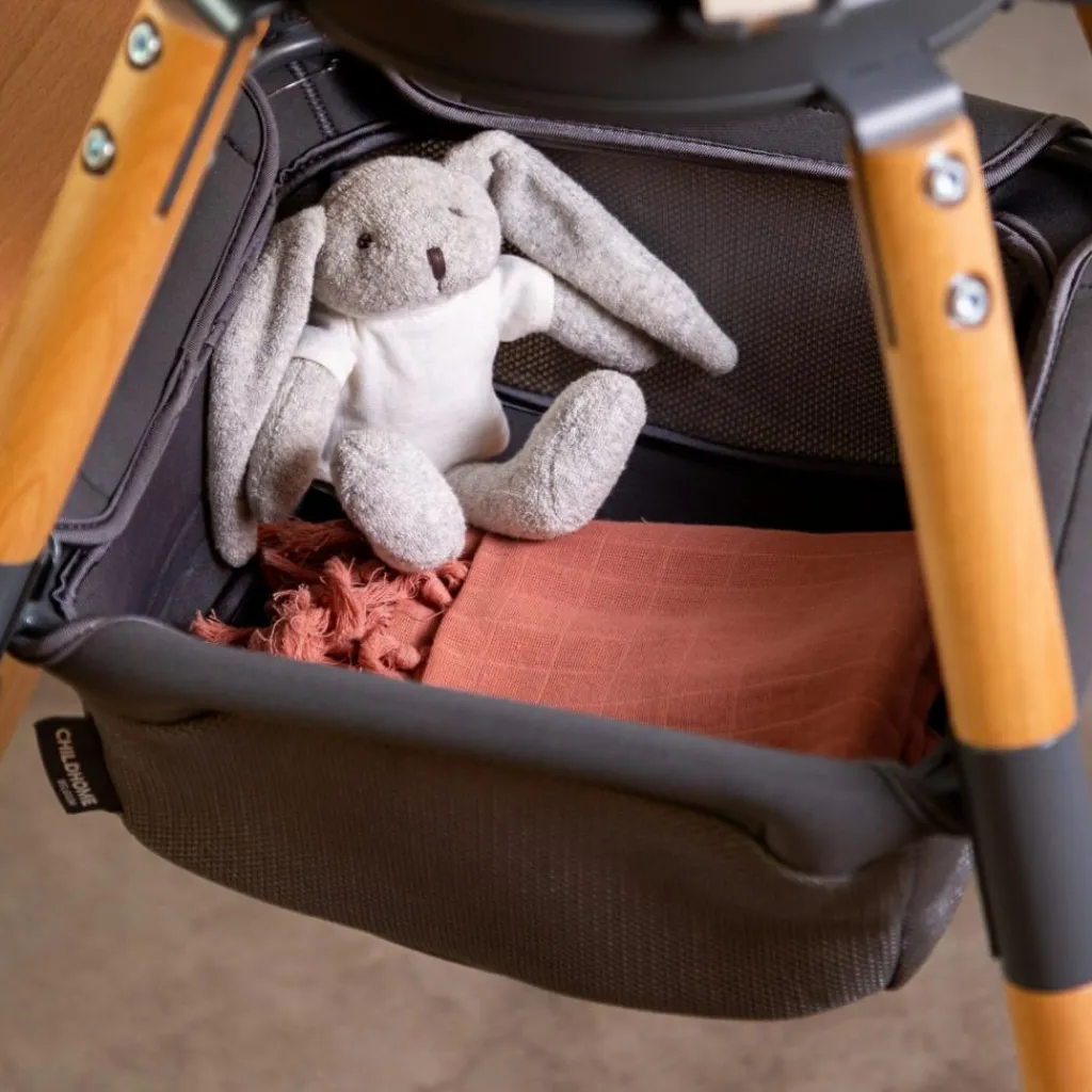 – A monter sur le cadre métallique sous l’assise de la chaise haute.