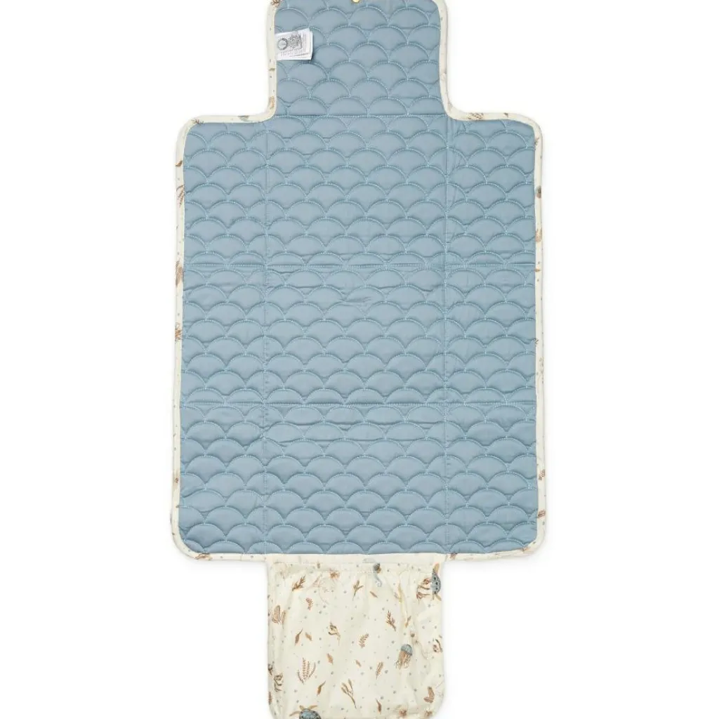 – Matelas à langer de voyage, matelassé dans les tons vert, marron et bleu sur fond blanc crème.